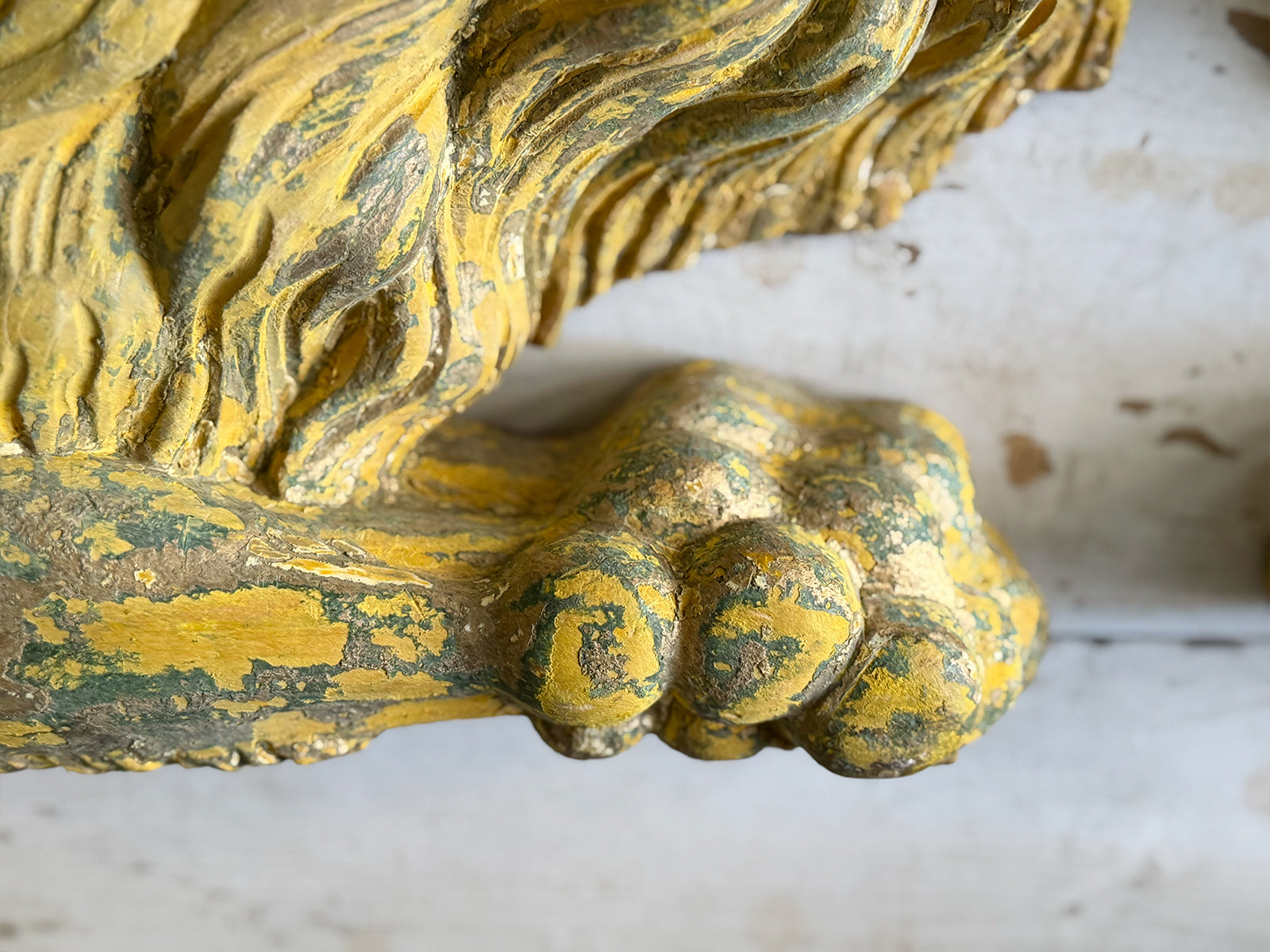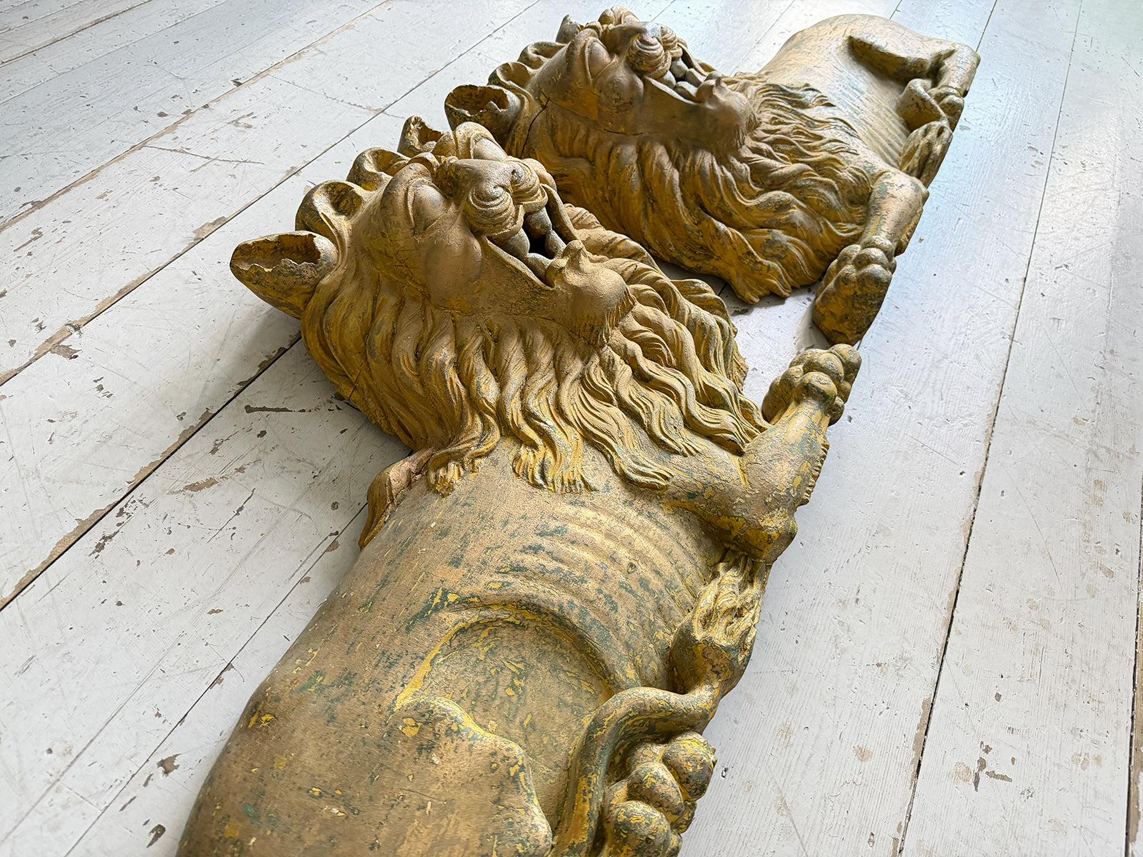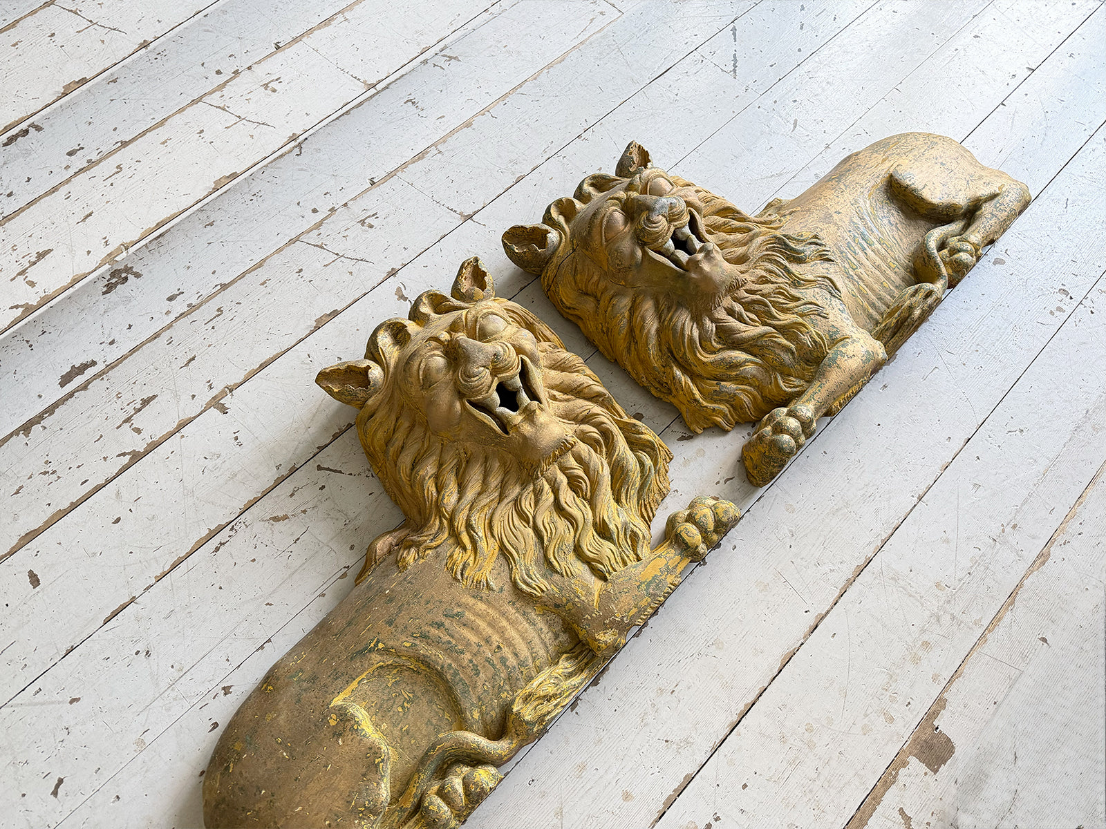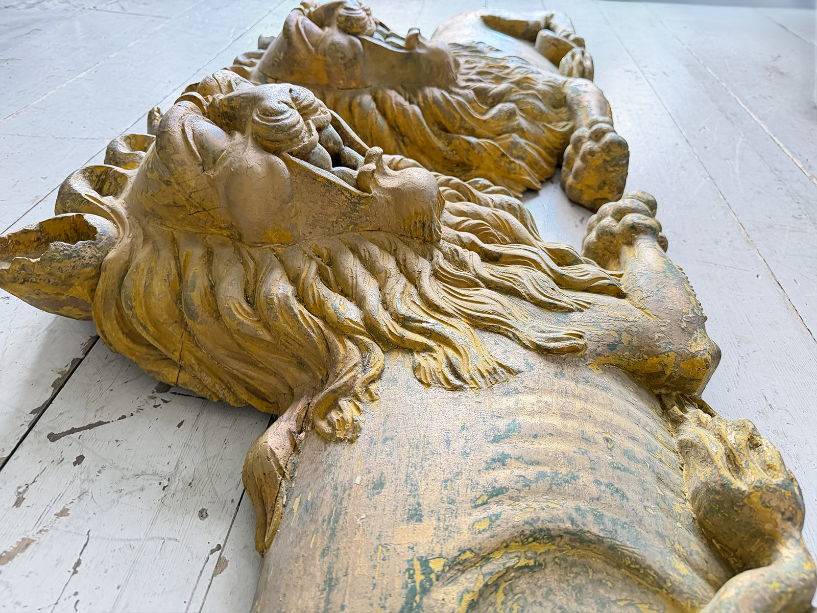 A striking, hand carved pair of Chinese Foo Dogs or Chinese Guardian Lions of large scale. Highly symbolic in Chinese culture, these represent protection, strength, courage and good luck. The fine carving has a three dimensional quality. Layers of later paint have been carefully removed by hand to reveal the original gilding. The melding of lion-like qualities such as the mane, with Foo Dog features indicates that these were most likely made for the European market.