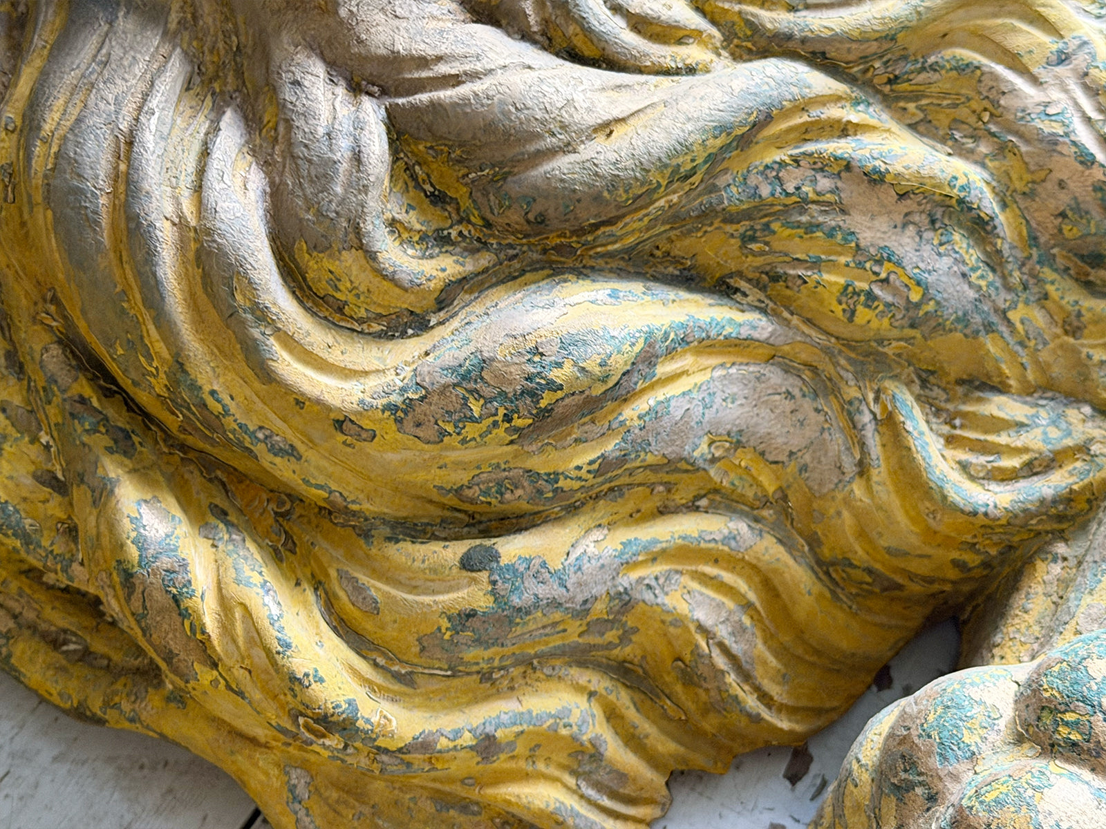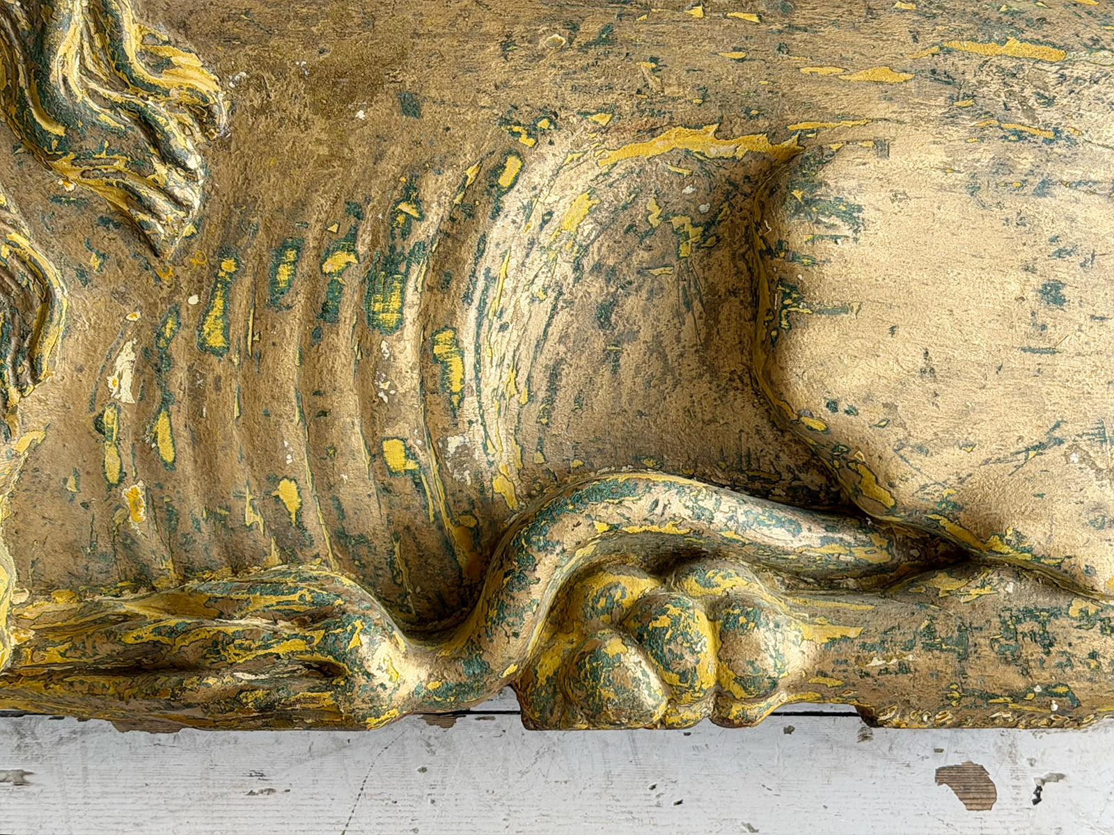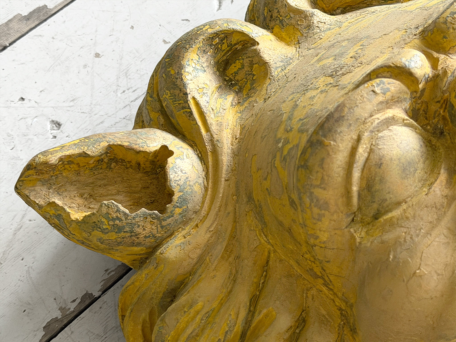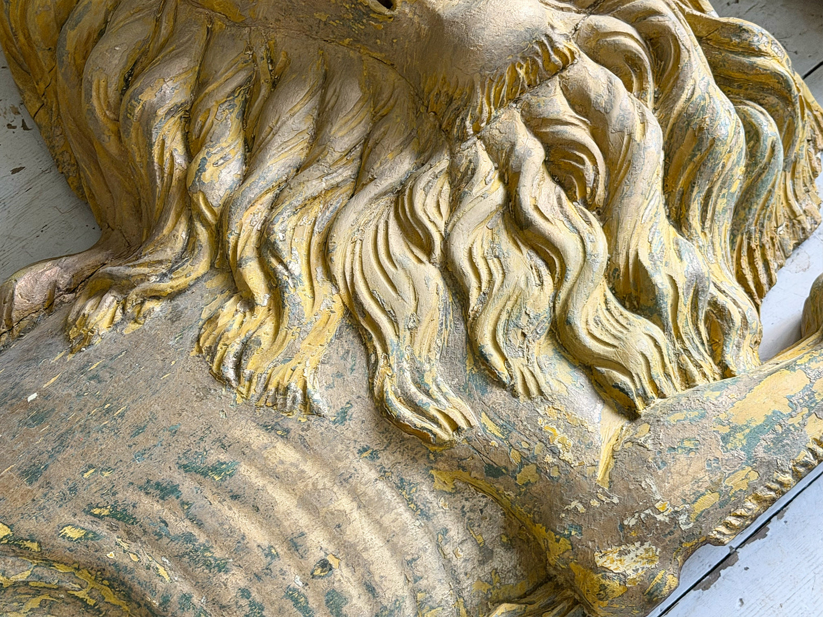 A striking, hand carved pair of Chinese Foo Dogs or Chinese Guardian Lions of large scale. Highly symbolic in Chinese culture, these represent protection, strength, courage and good luck. The fine carving has a three dimensional quality. Layers of later paint have been carefully removed by hand to reveal the original gilding. The melding of lion-like qualities such as the mane, with Foo Dog features indicates that these were most likely made for the European market.
