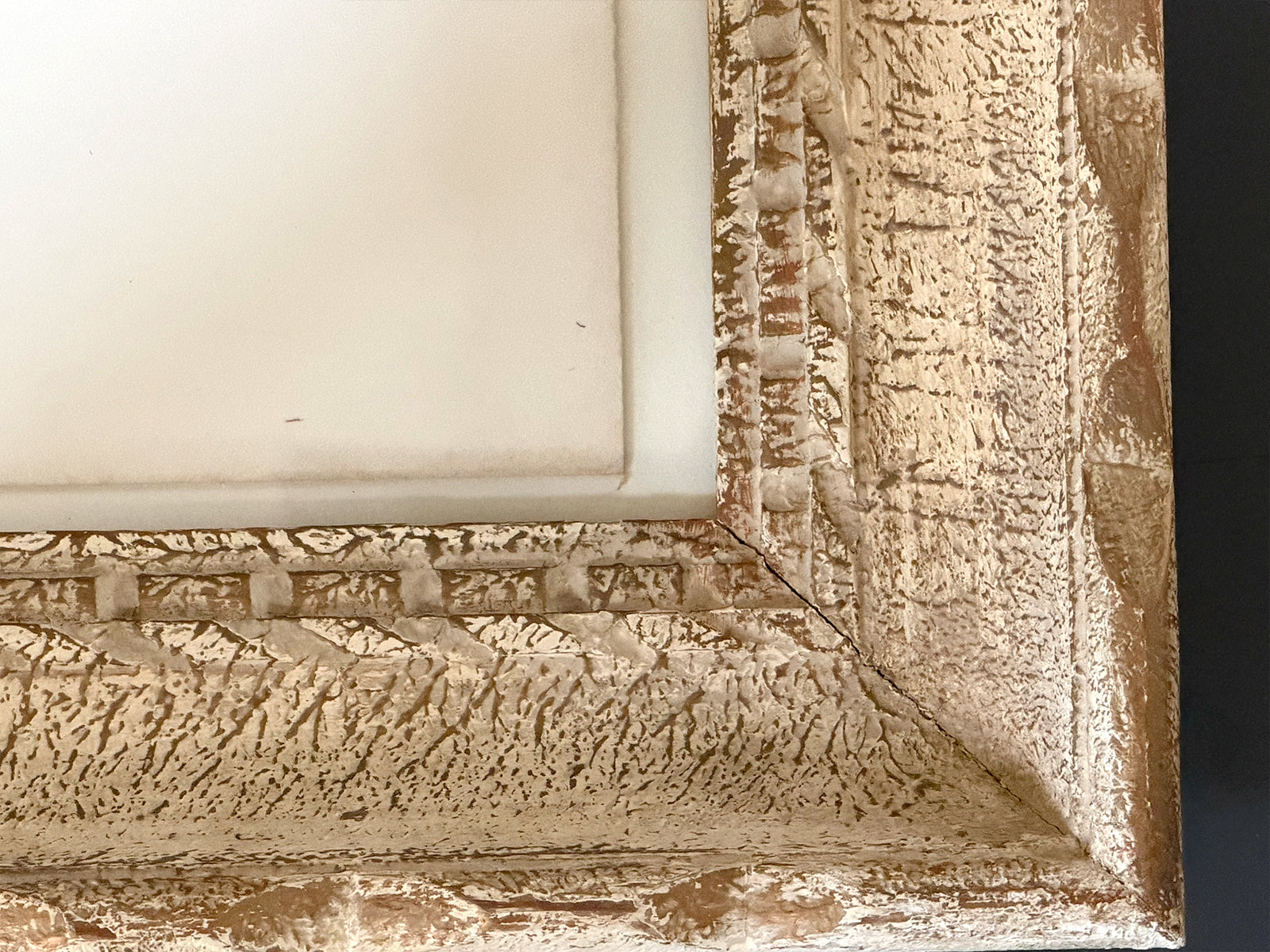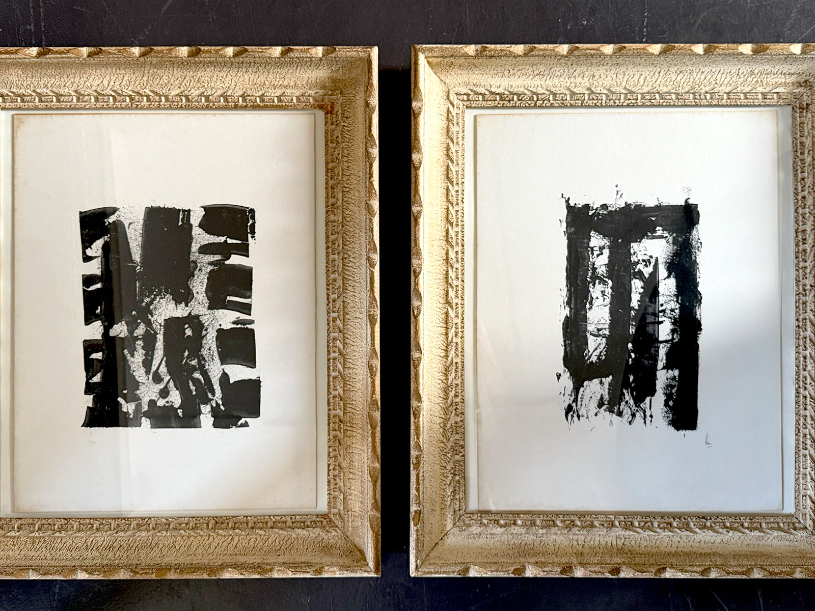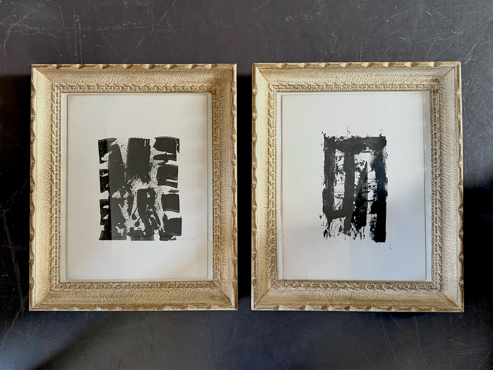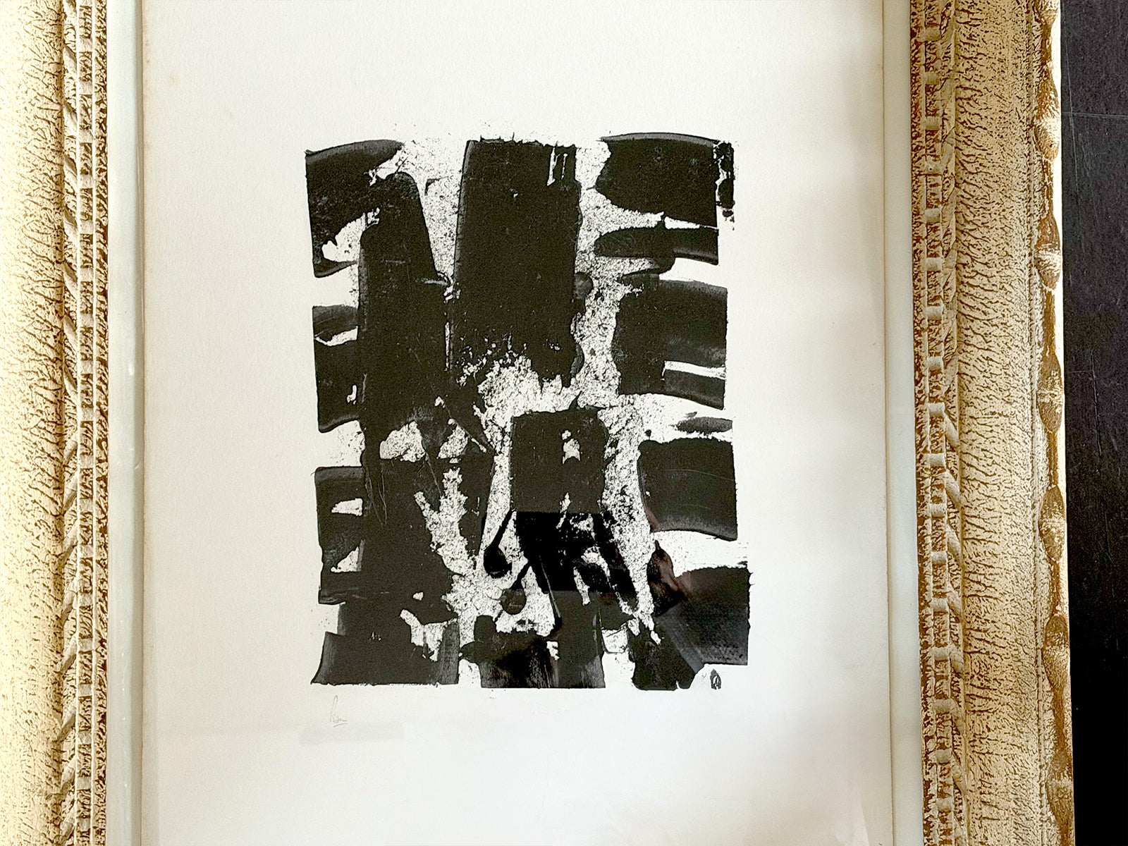 We have purchased three pieces by the same artist (signature illegible, but we believe British). Each one is black acrylic and dates from around 1960. We have framed two on them in matching vintage Montparnasse frames.