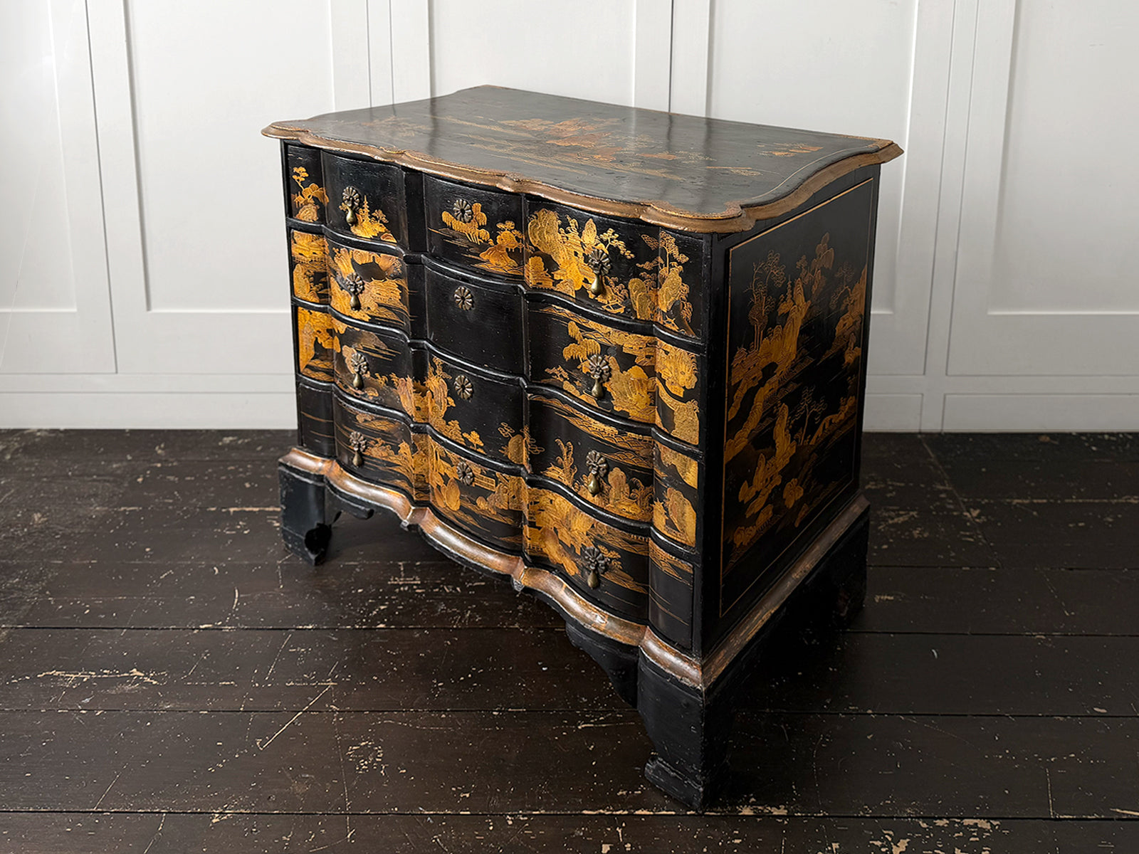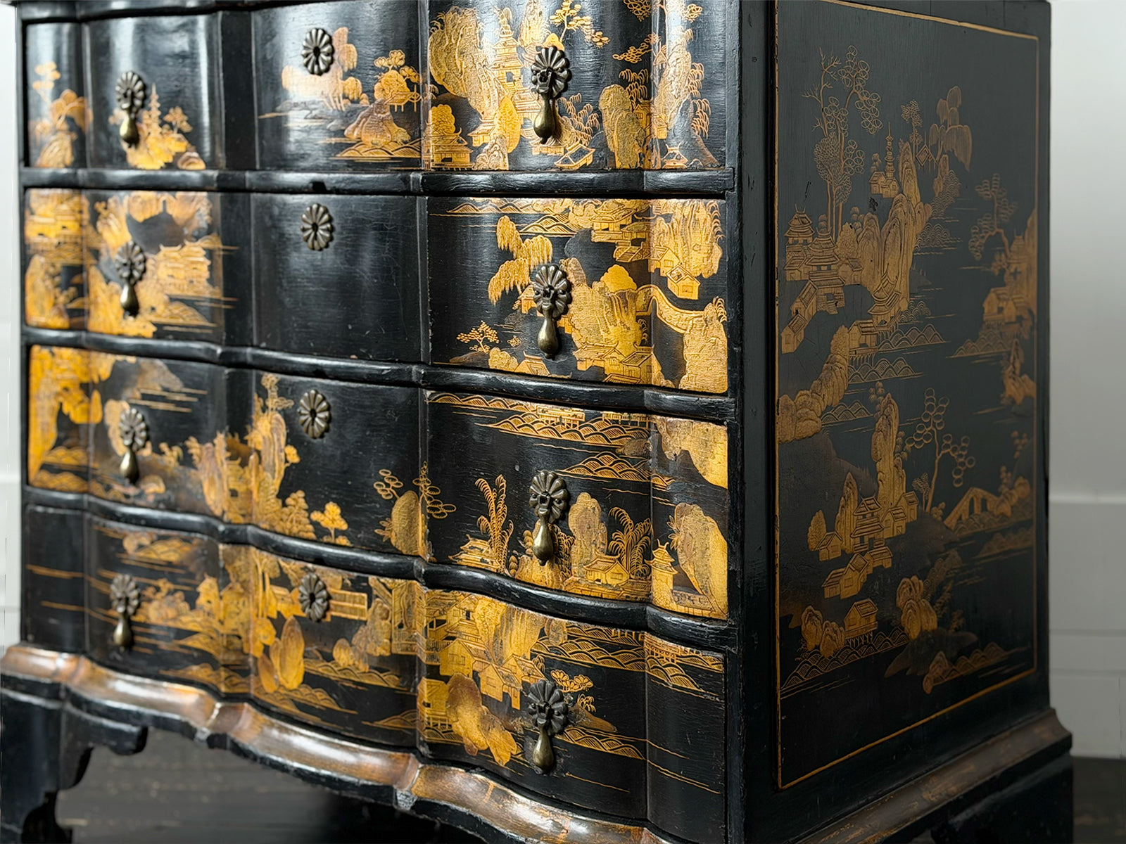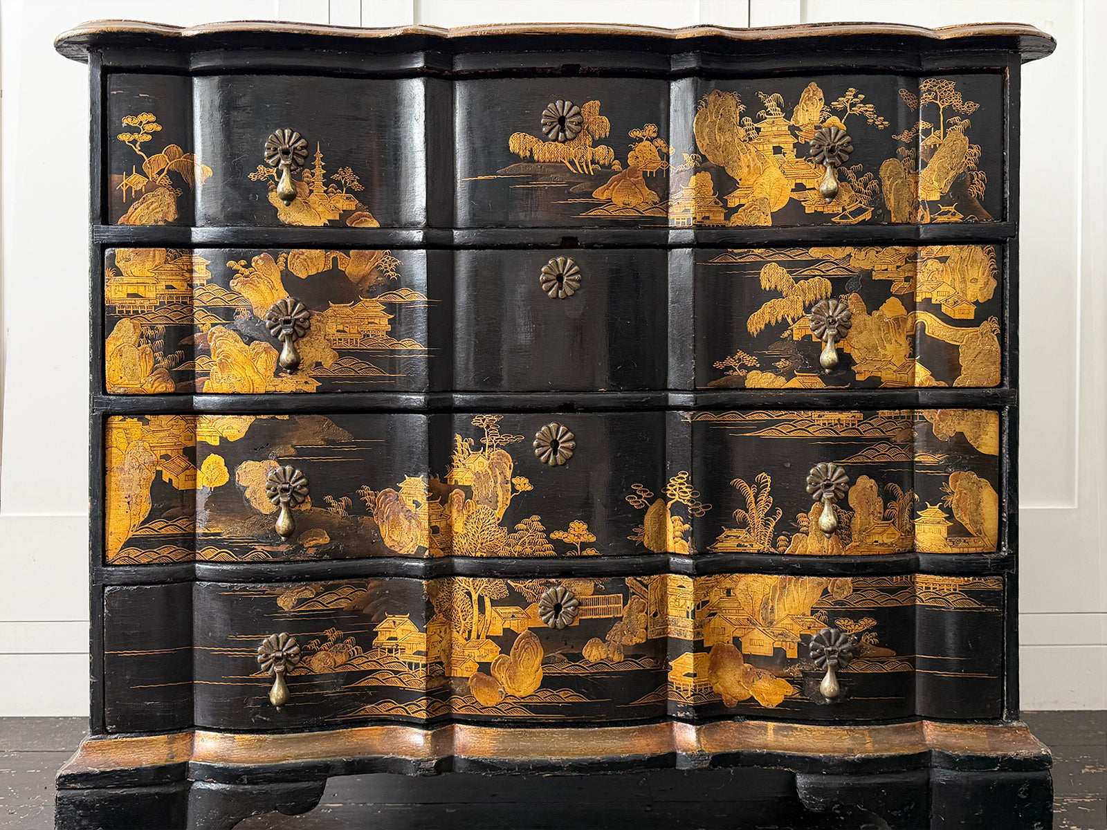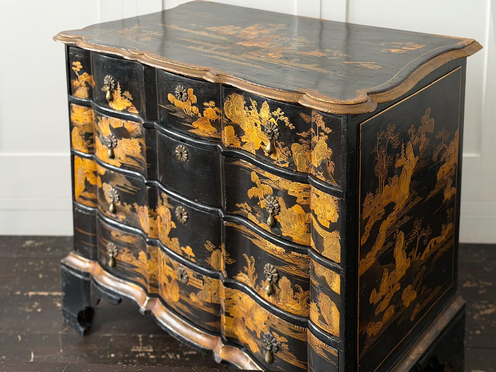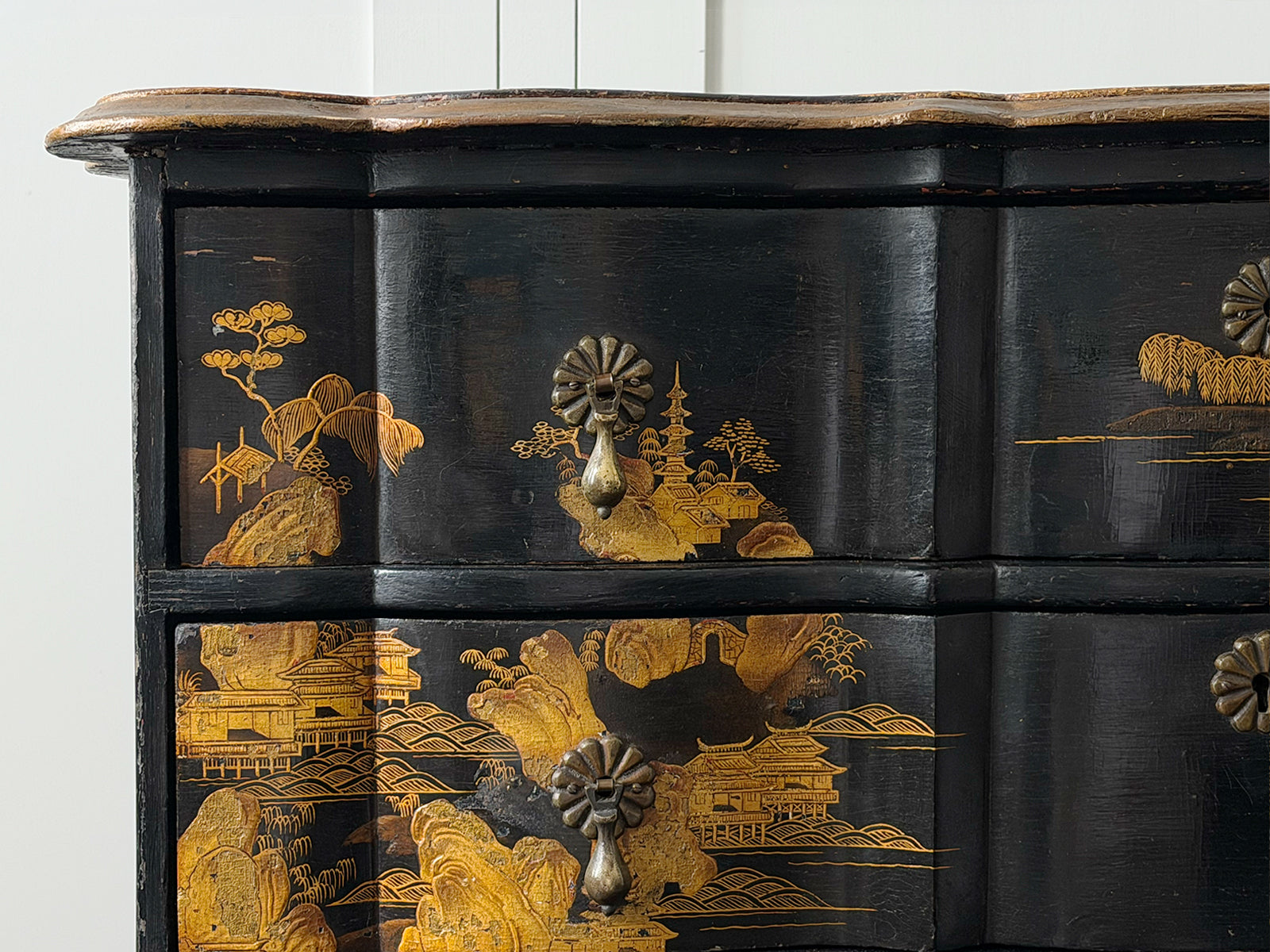 An 18th C Dutch Japanned chest with fine Chinoiserie decoration to all sides and top. With elegant shaped front and top. Brass handles and escutcheons.