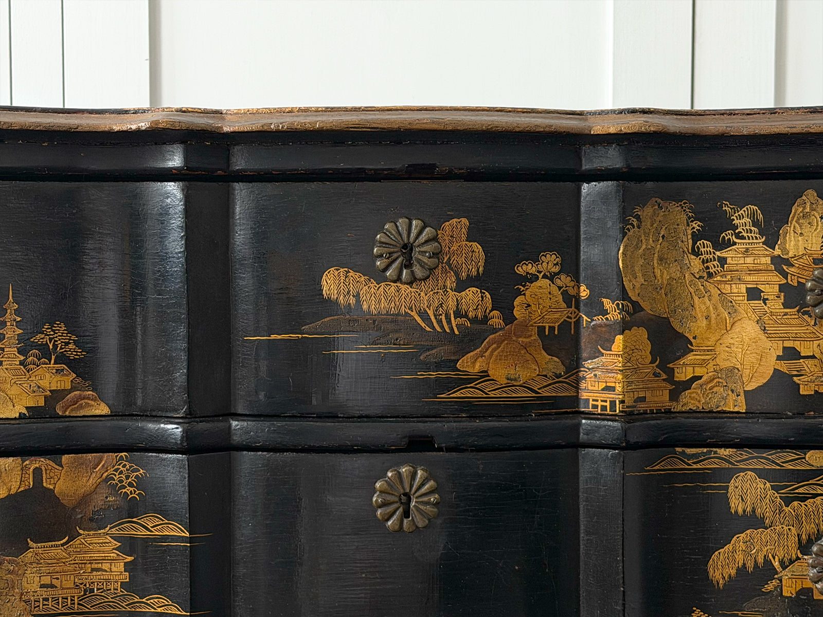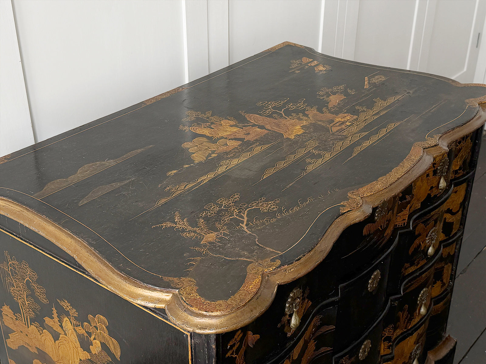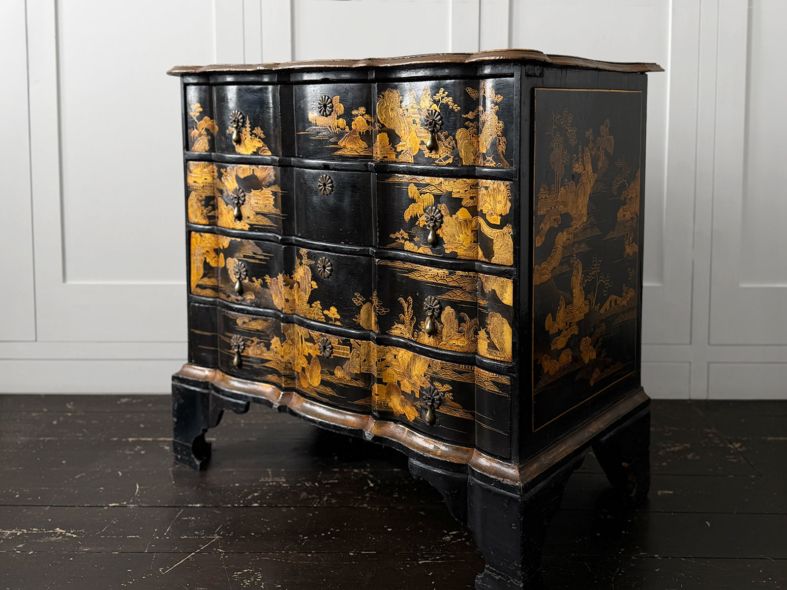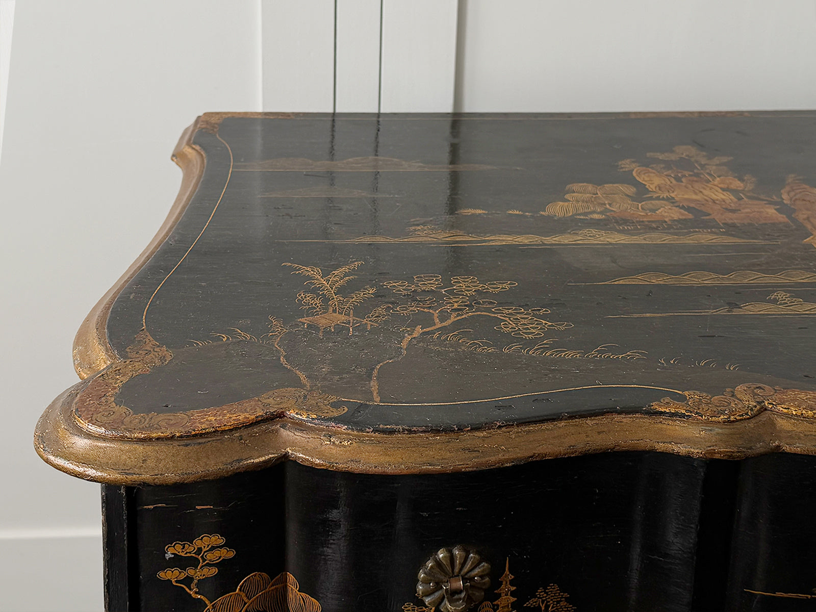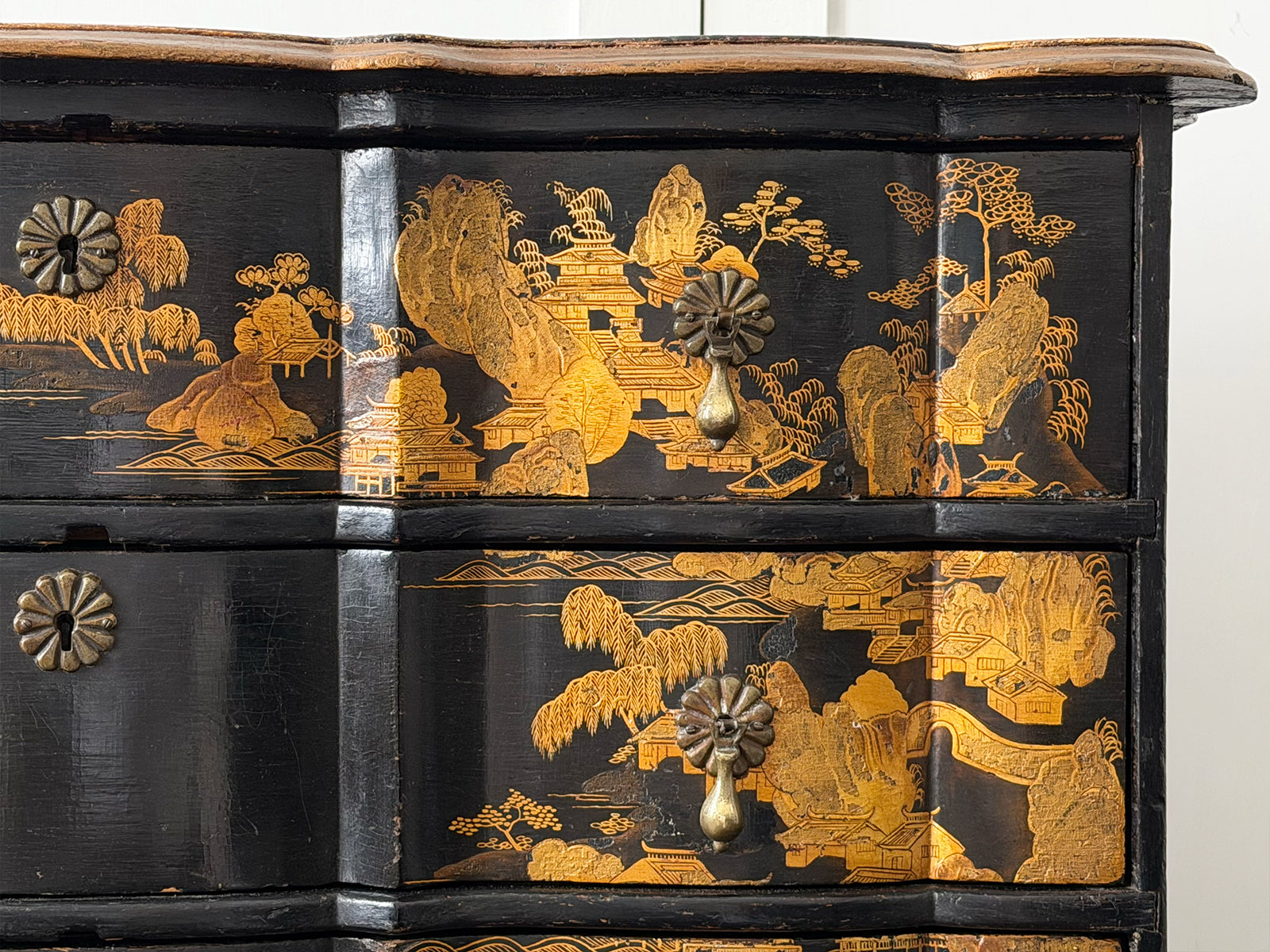 An 18th C Dutch Japanned chest with fine Chinoiserie decoration to all sides and top. With elegant shaped front and top. Brass handles and escutcheons.