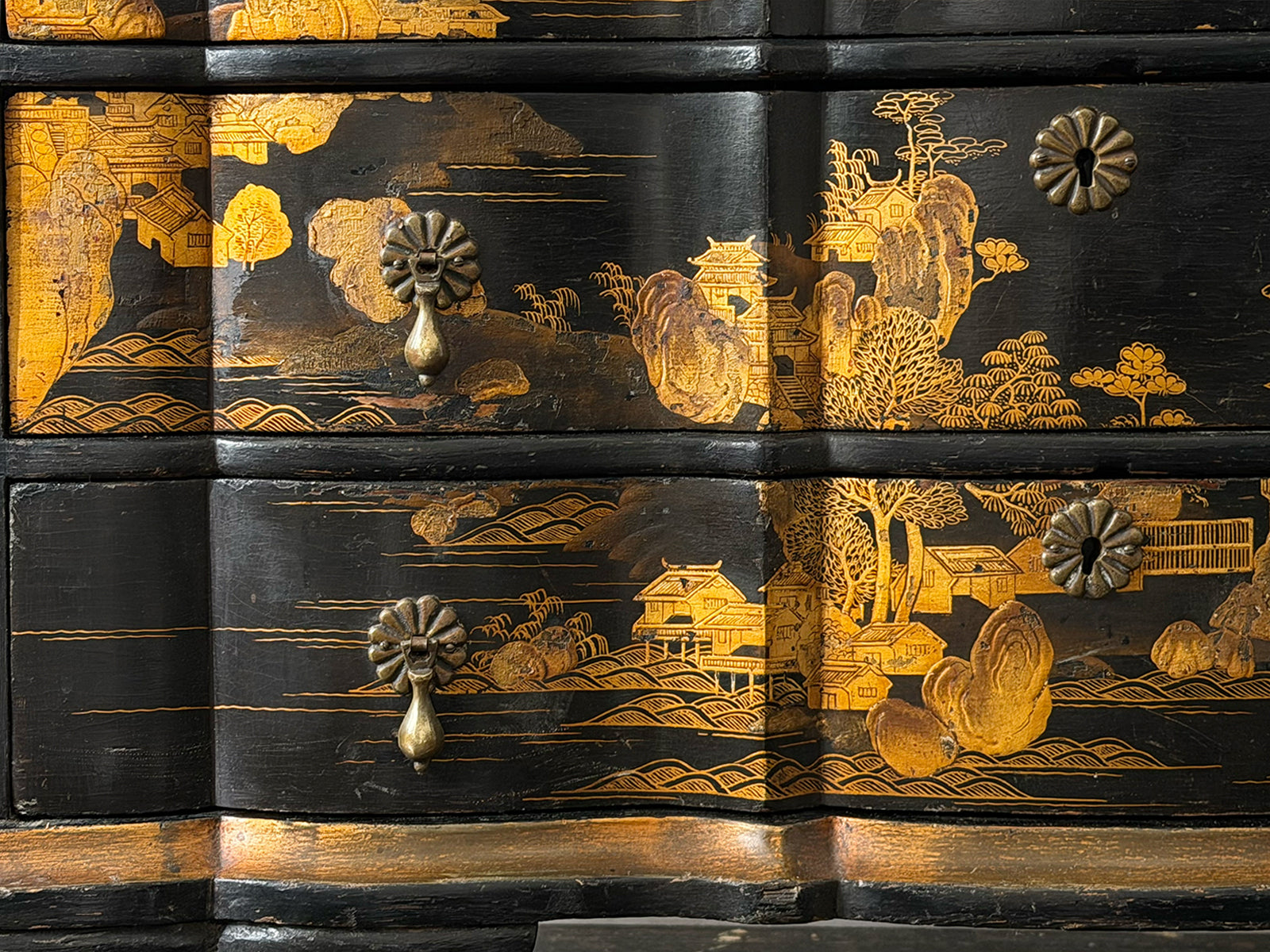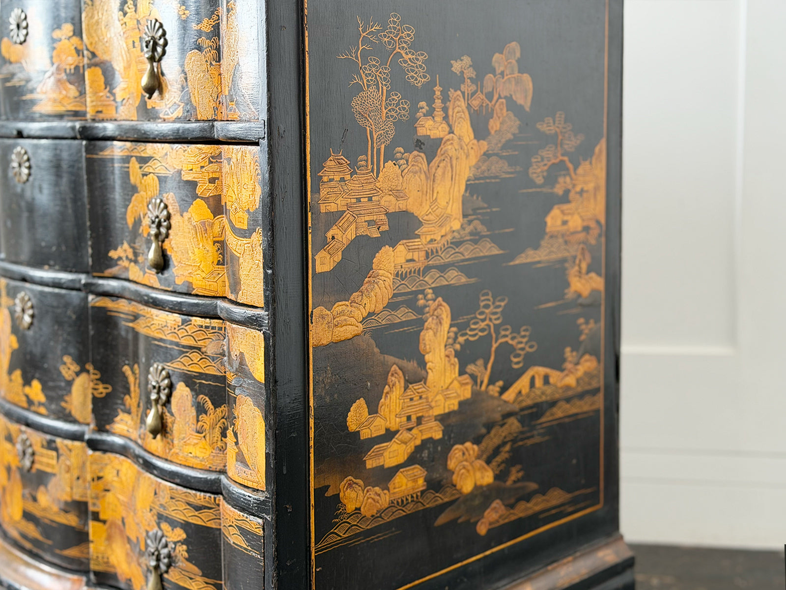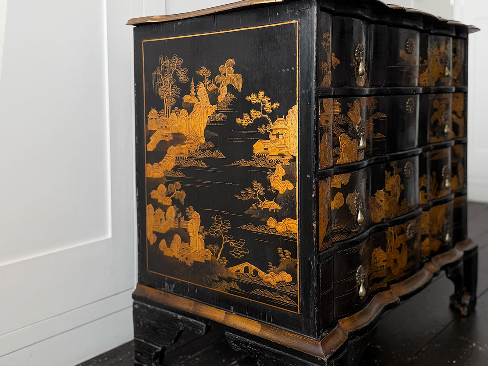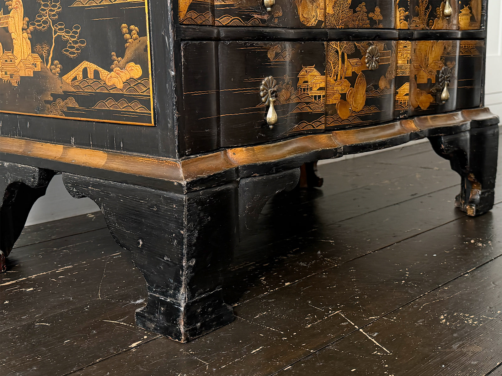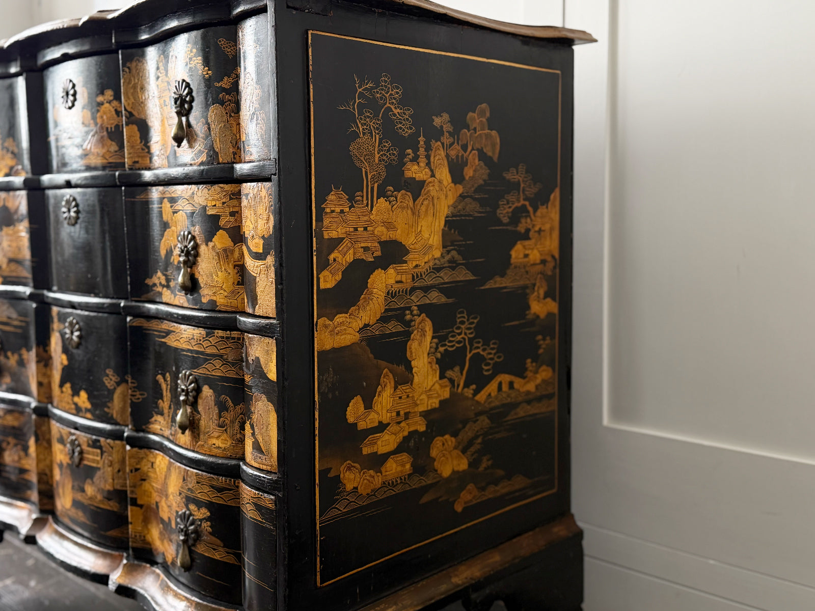 An 18th C Dutch Japanned chest with fine Chinoiserie decoration to all sides and top. With elegant shaped front and top. Brass handles and escutcheons.