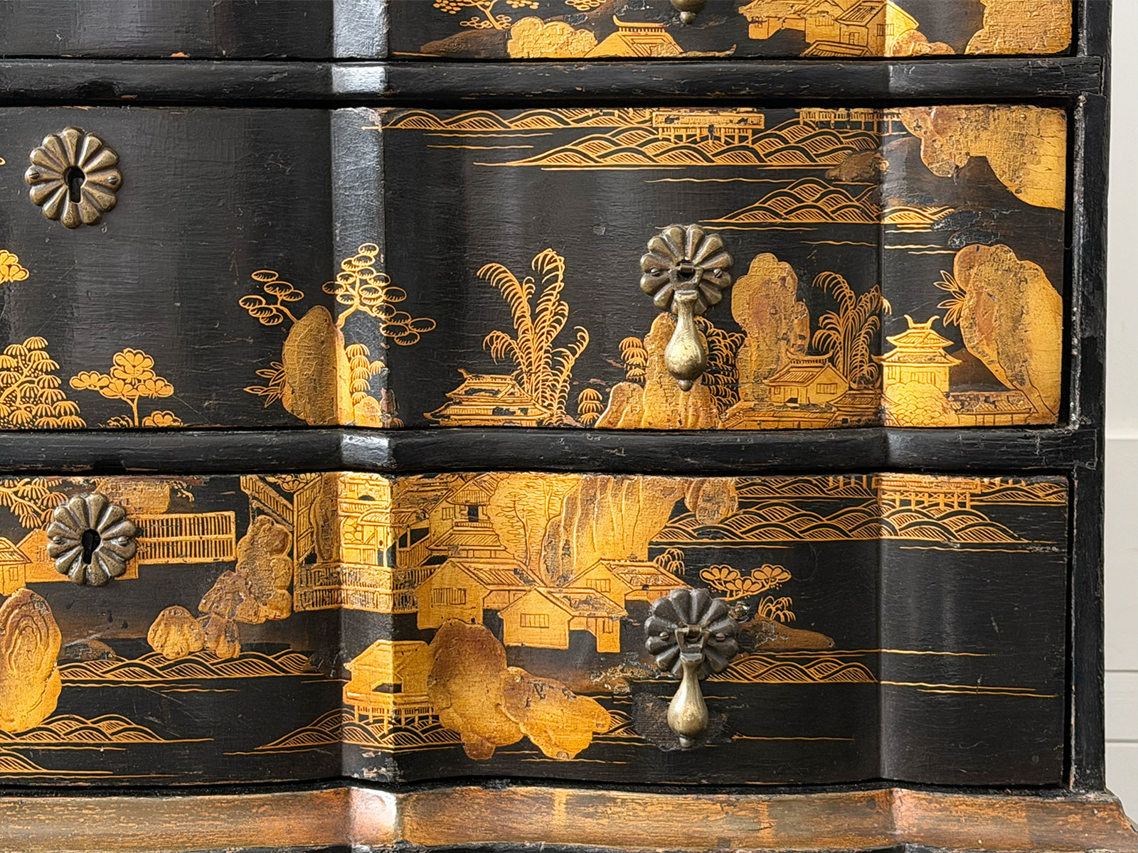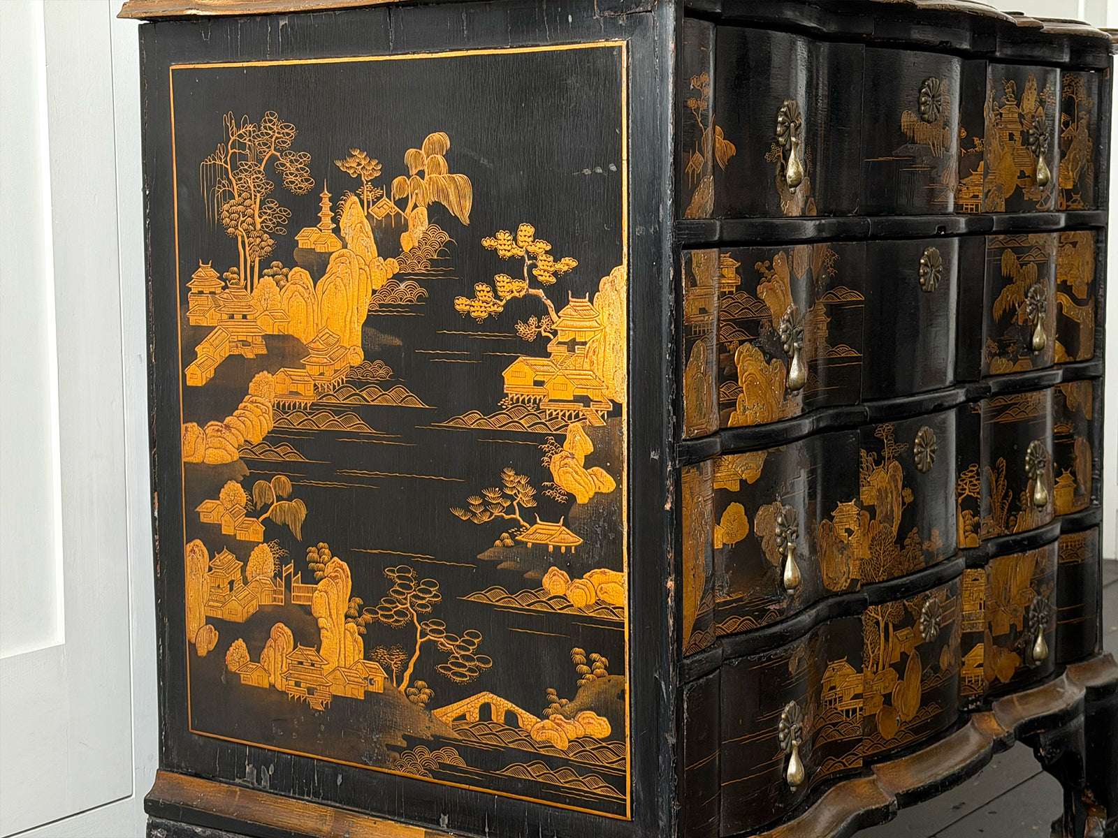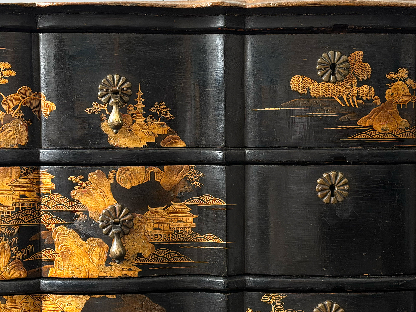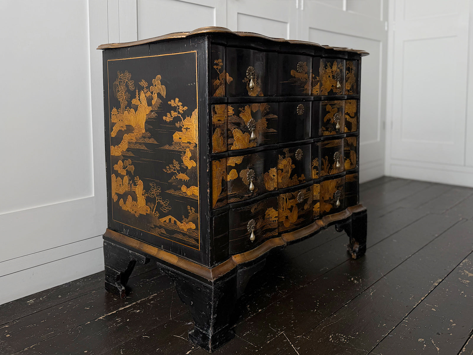 An 18th C Dutch Japanned chest with fine Chinoiserie decoration to all sides and top. With elegant shaped front and top. Brass handles and escutcheons.