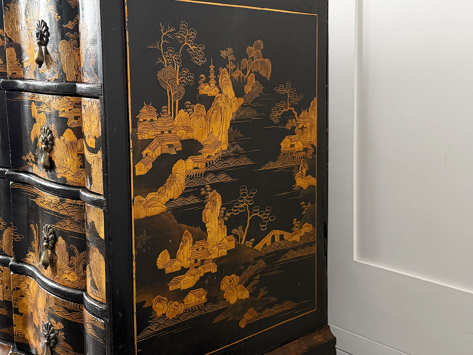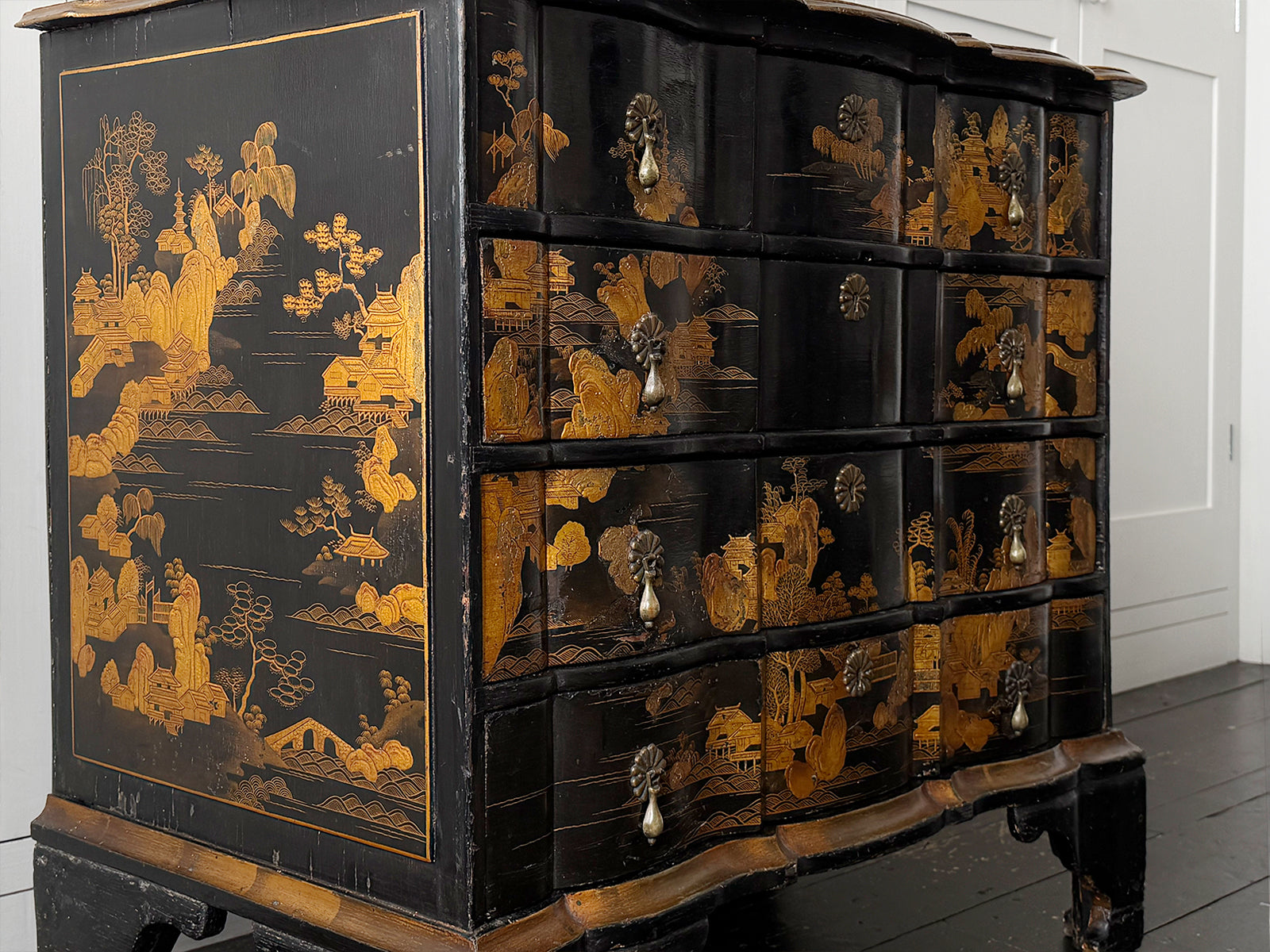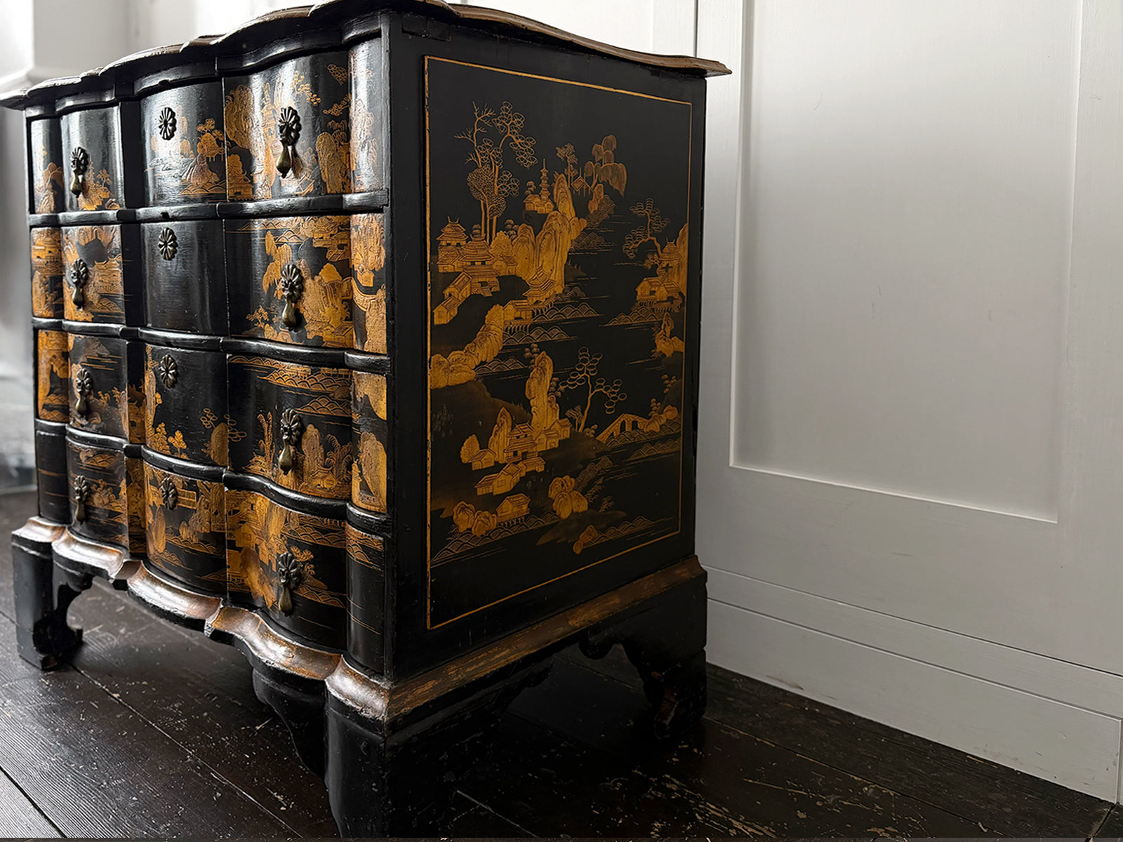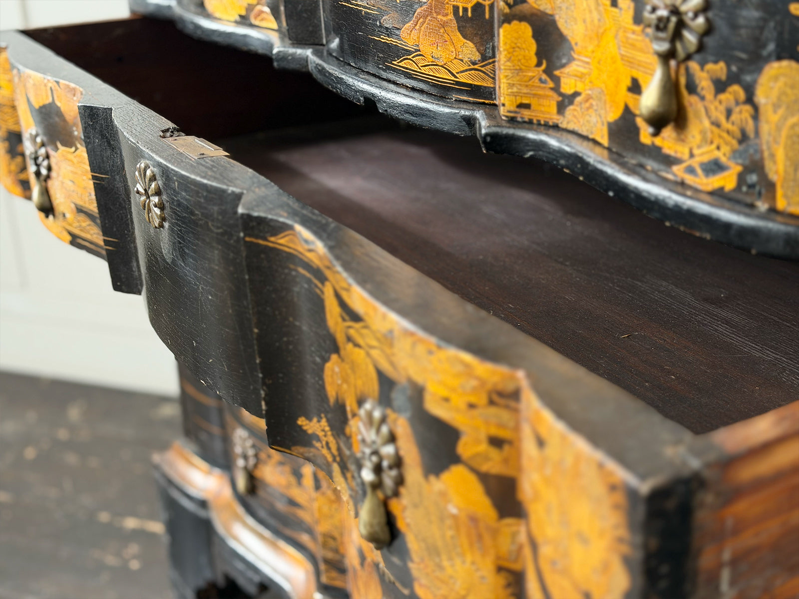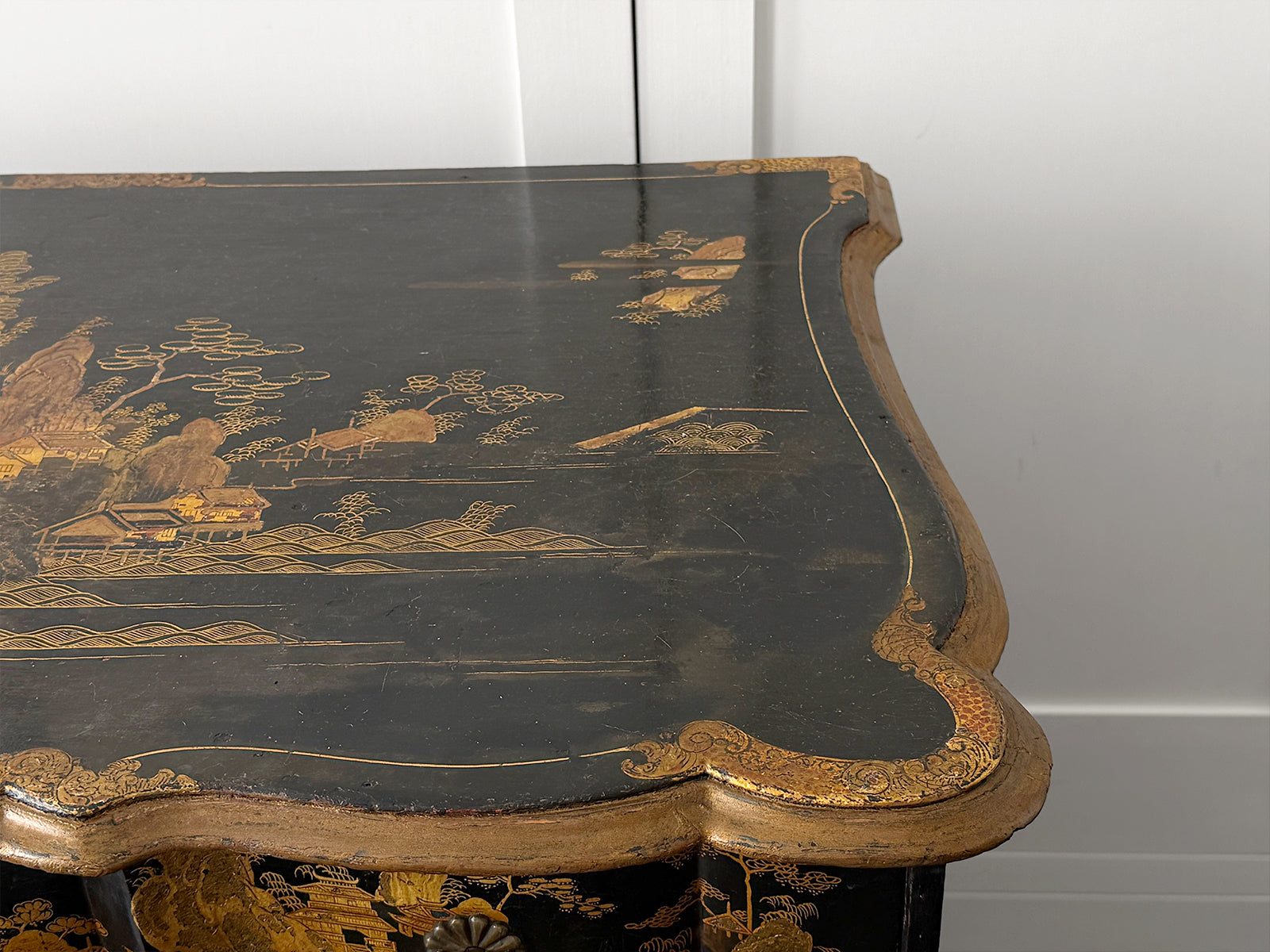An 18th C Dutch Japanned chest with fine Chinoiserie decoration to all sides and top. With elegant shaped front and top. Brass handles and escutcheons.