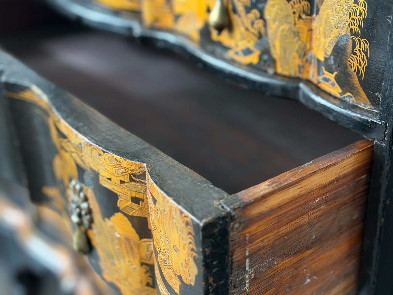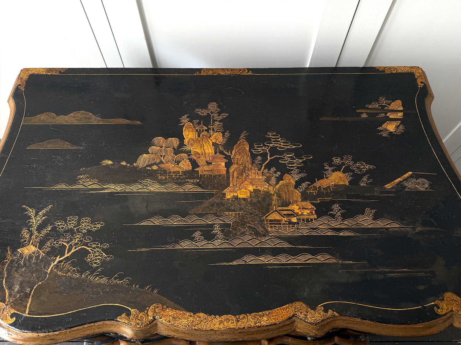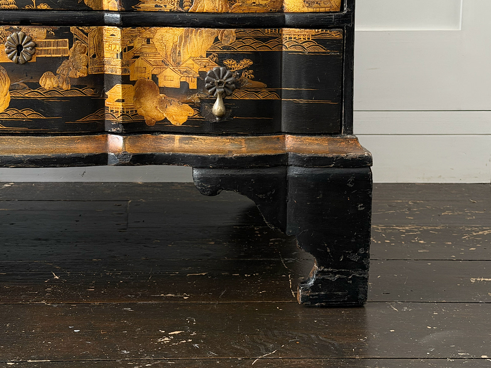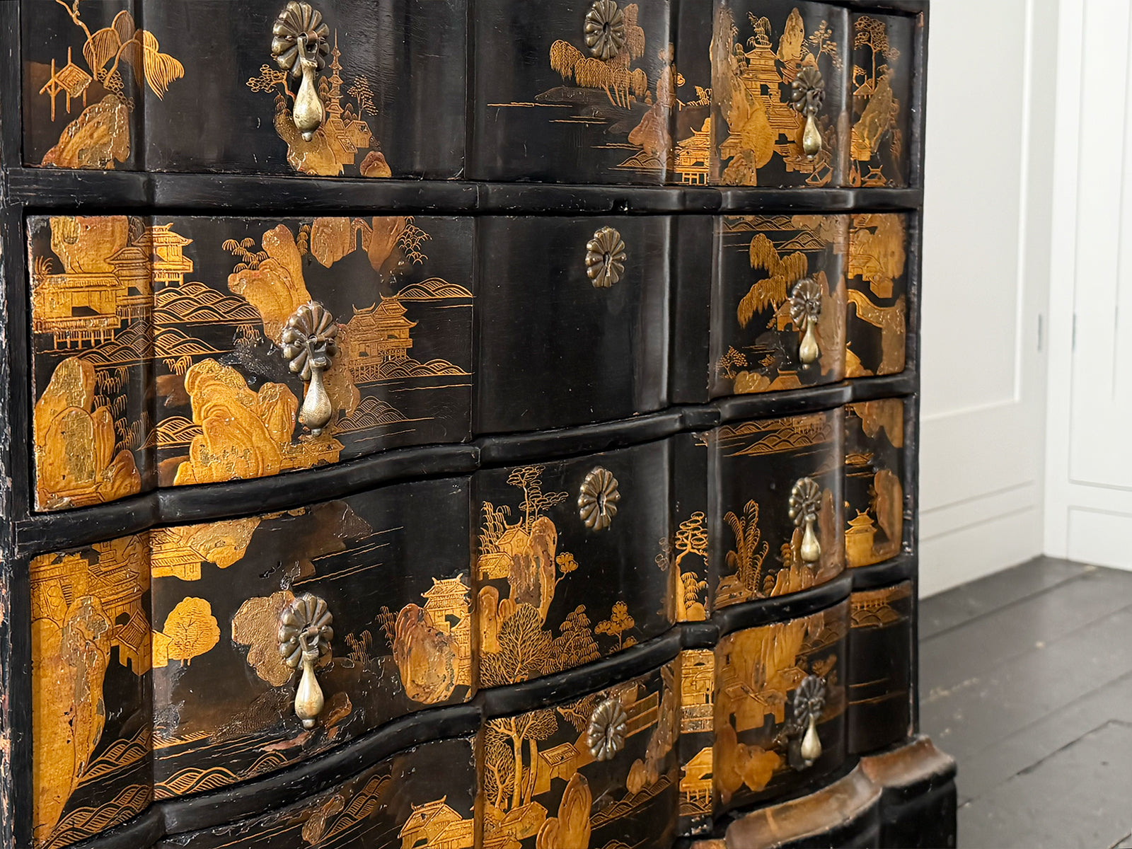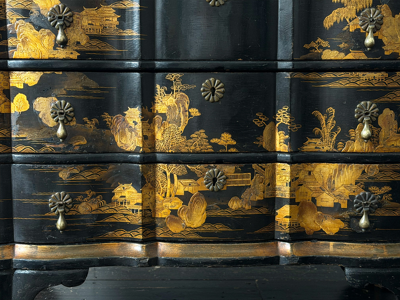 An 18th C Dutch Japanned chest with fine Chinoiserie decoration to all sides and top. With elegant shaped front and top. Brass handles and escutcheons.