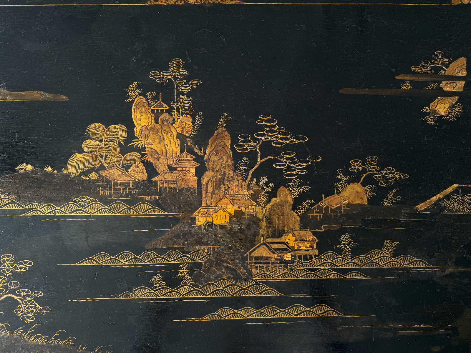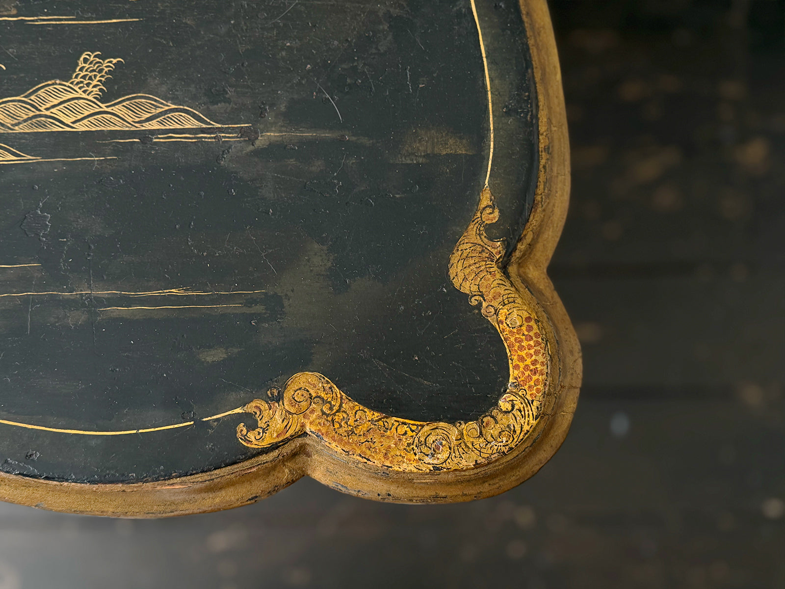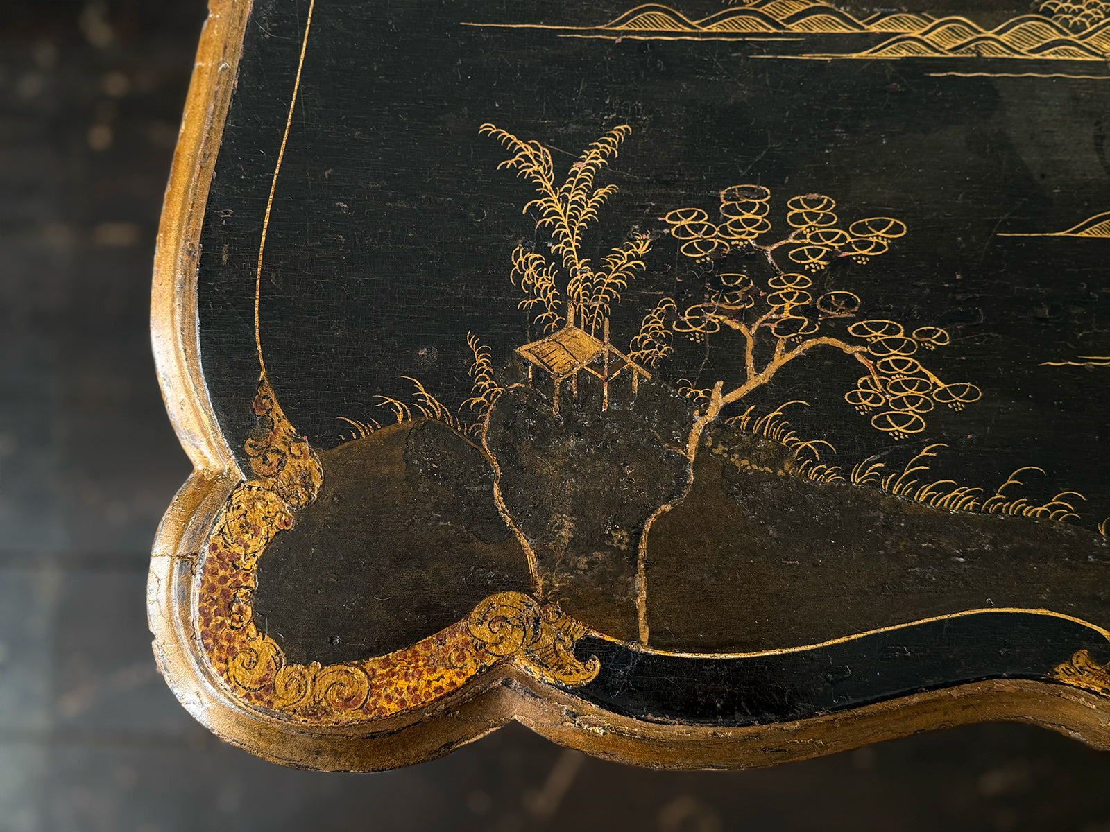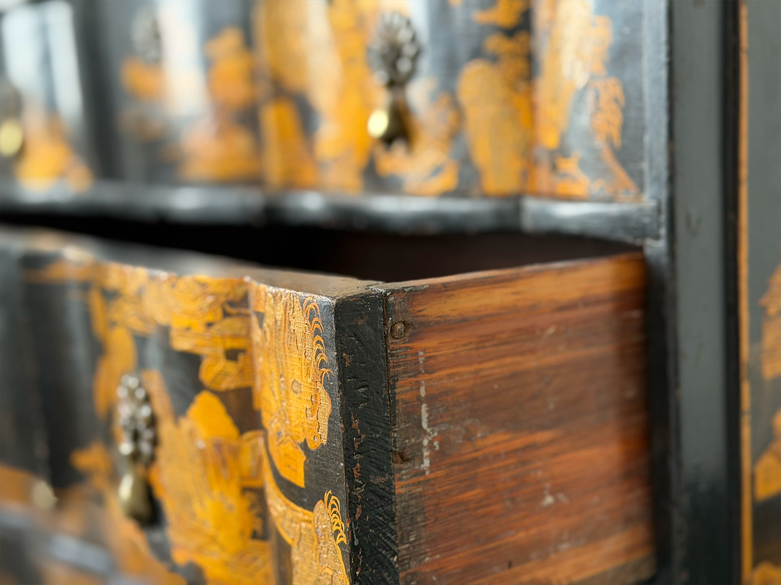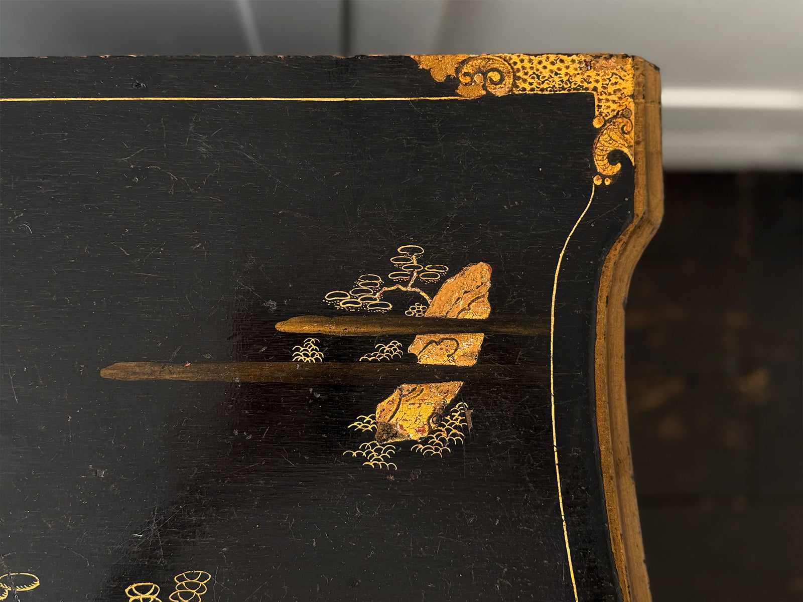 An 18th C Dutch Japanned chest with fine Chinoiserie decoration to all sides and top. With elegant shaped front and top. Brass handles and escutcheons.