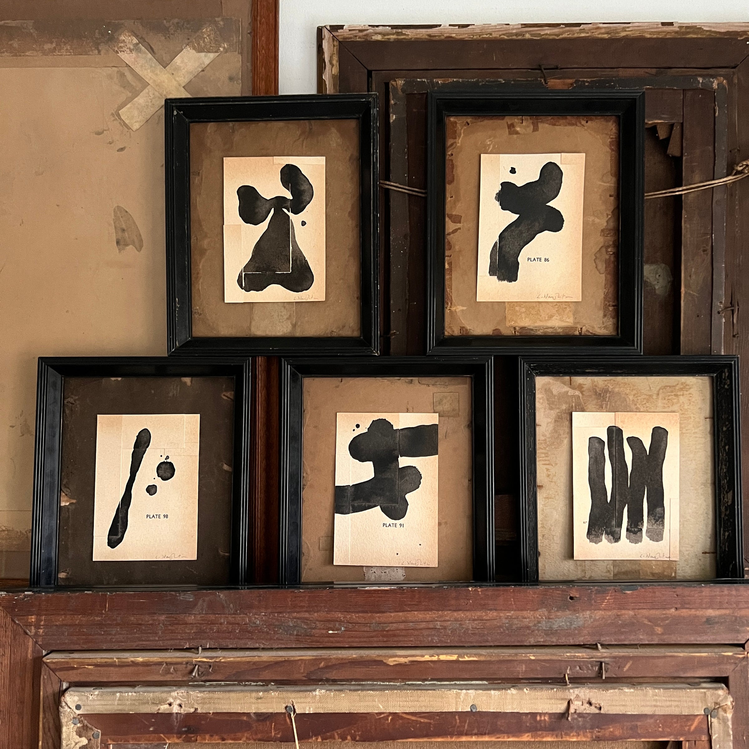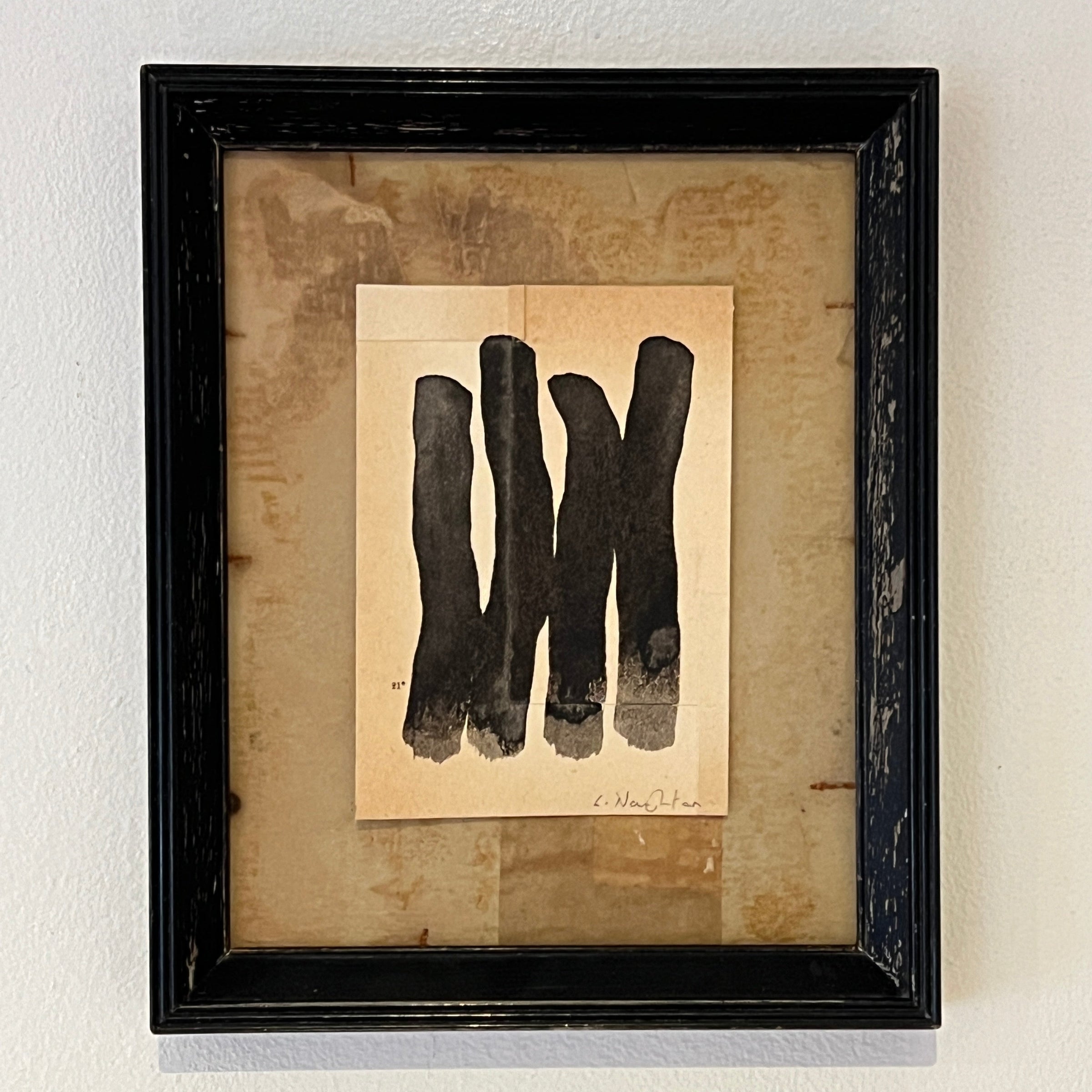 One of a group of five smaller abstract pieces in Lucy Naughton's Christmas 25 collection.  Each one a monochrome ink on found materials and in a vintage frame.