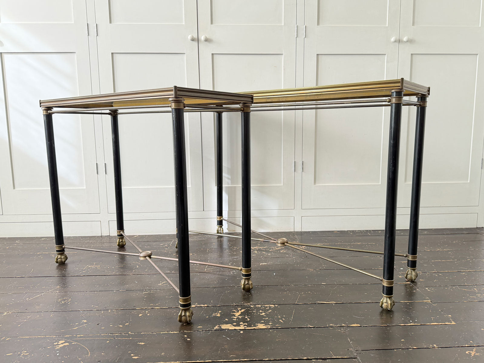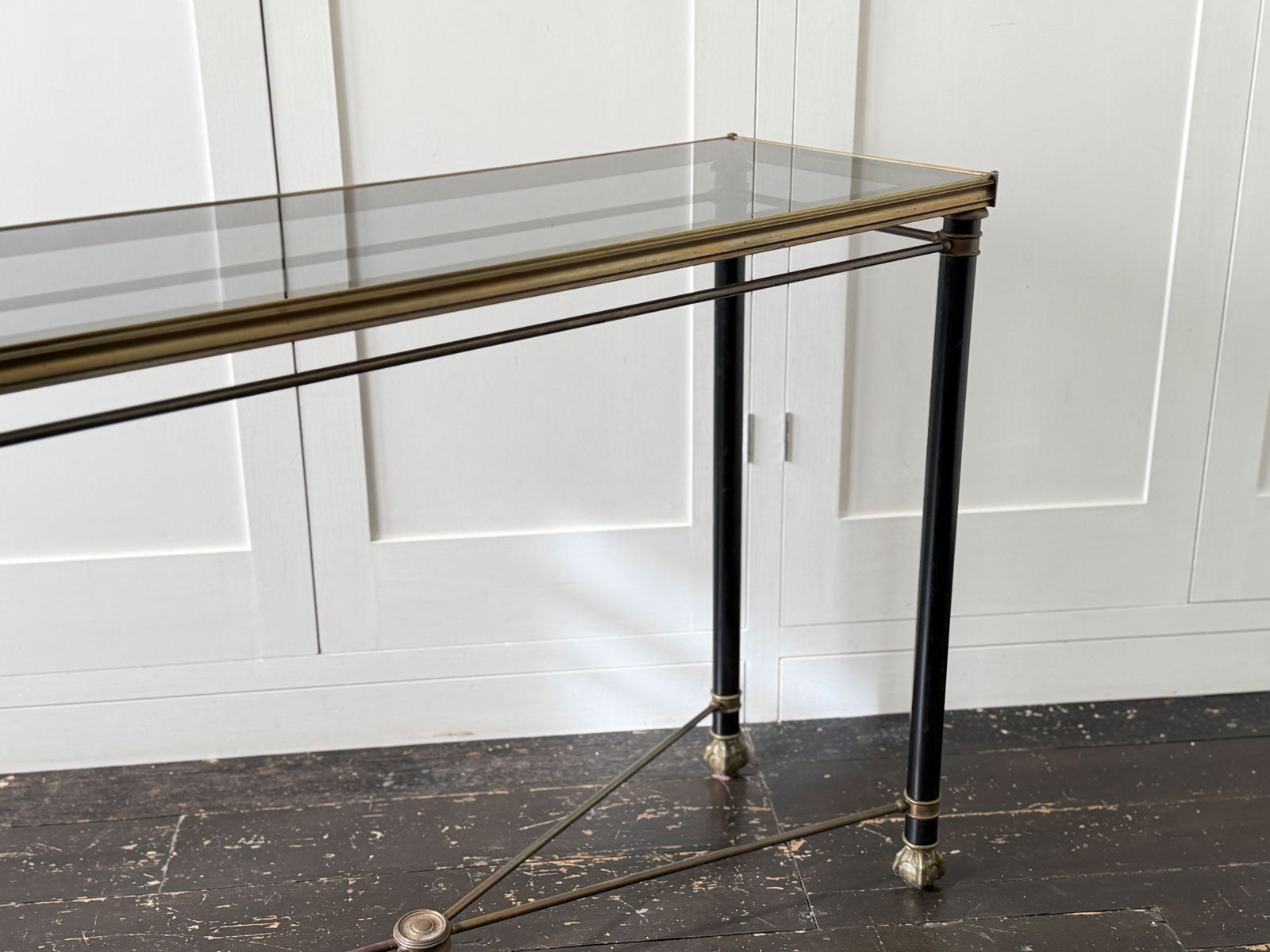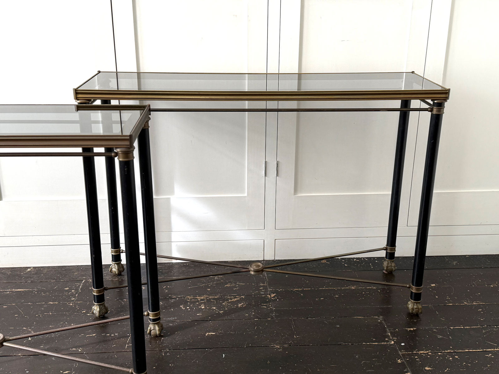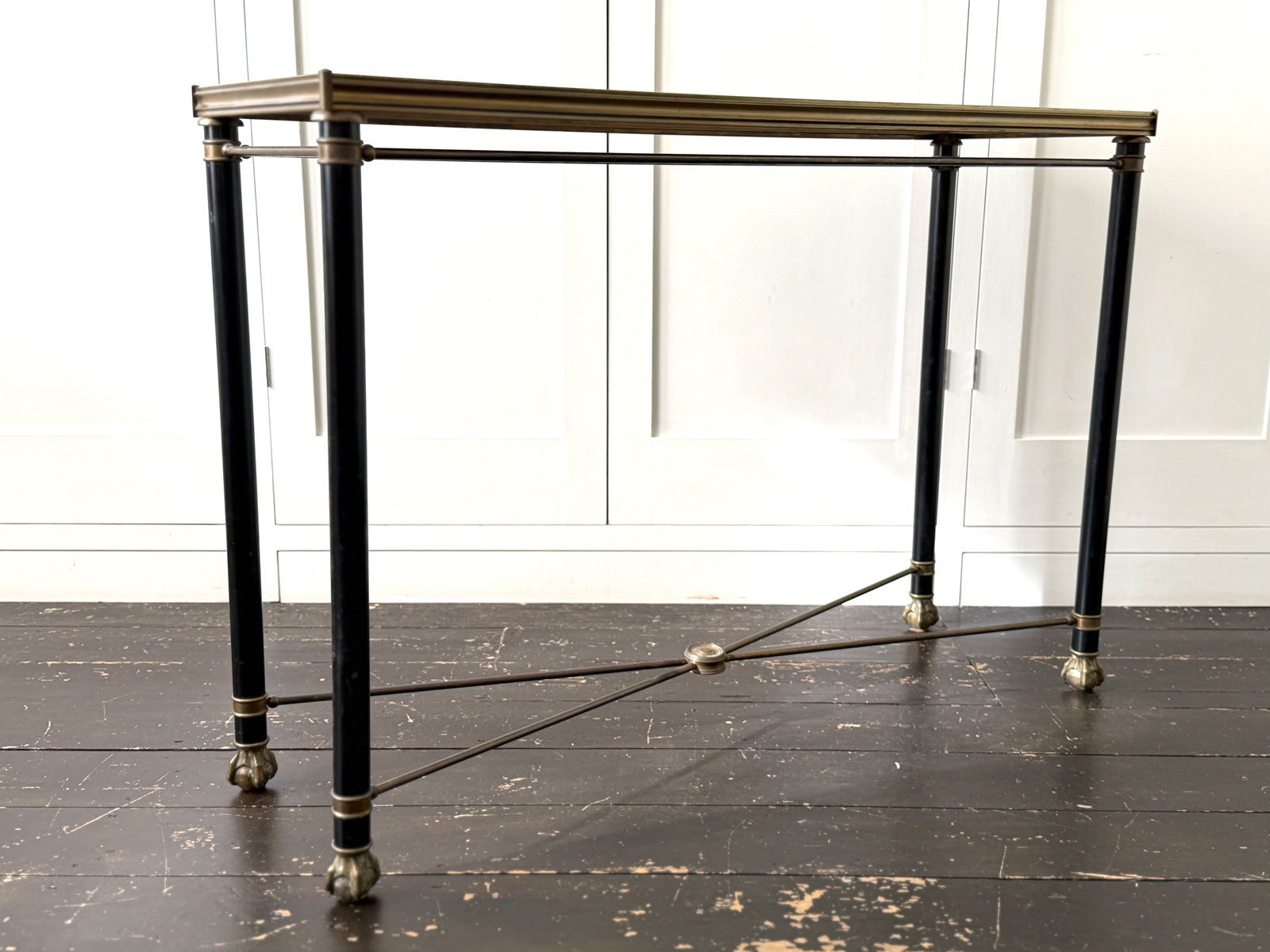 One of two differently sized but matching mid-century console tables of exceptional quality in a distinct Neoclassical design style by Maison Jansen (see p 297 of 'Jansen Furniture' by James Archer Abbott for similar design). With brass frame and black lacquered legs, the brass has a beautiful vintage patina. A notable feature is the use of classical motifs, specifically the decorative brass claw and ball feet, a design element typical of Maison Jansen's work and the central decorative medallion to the centre of the x-form stretcher.