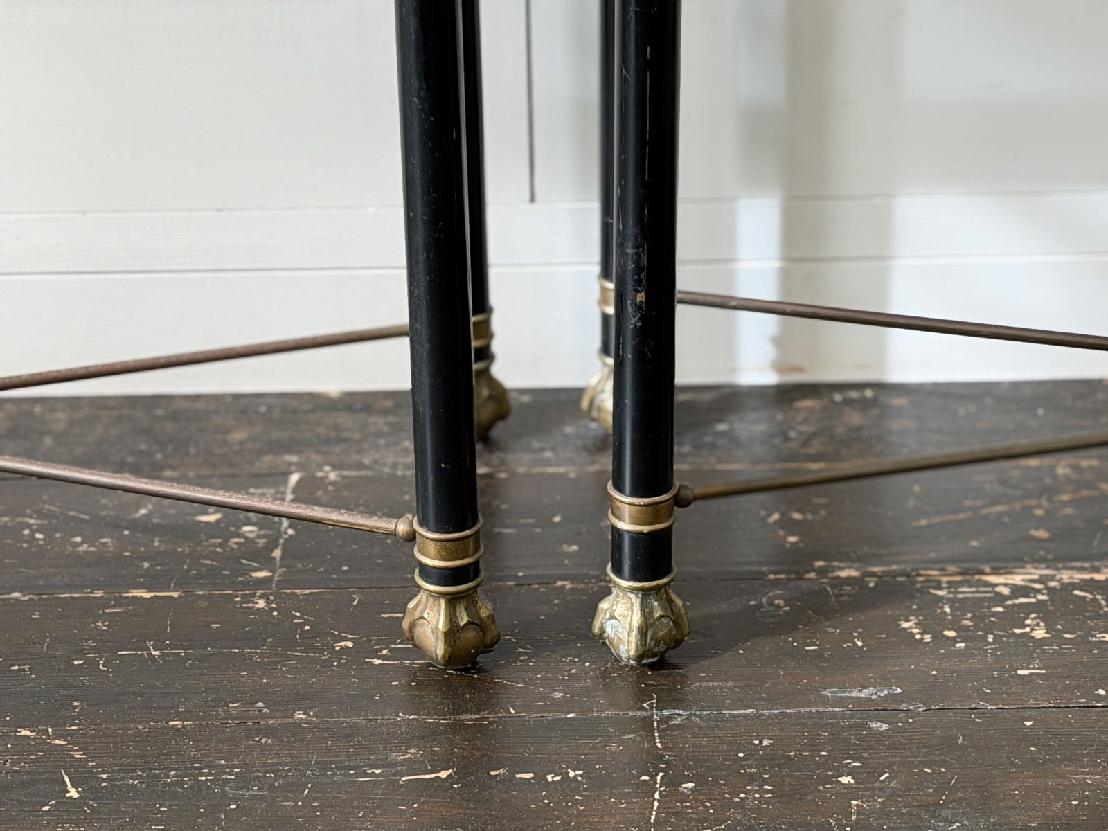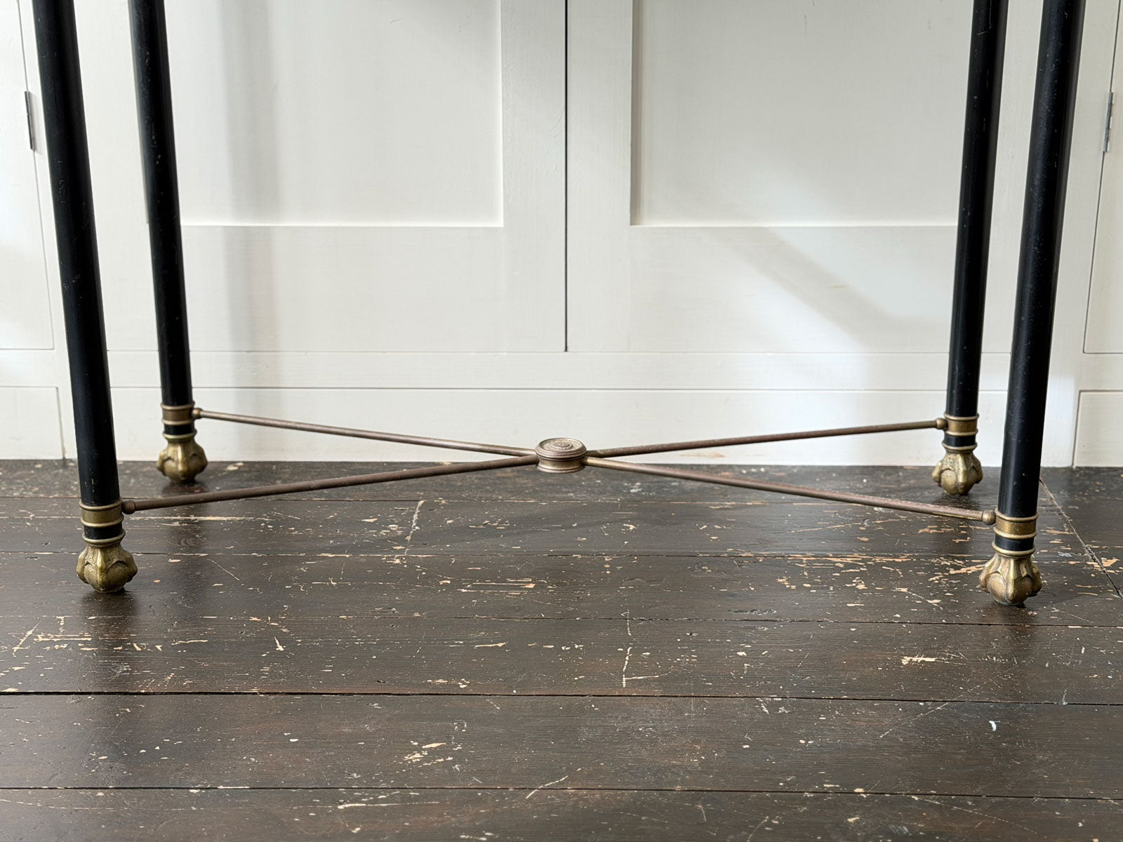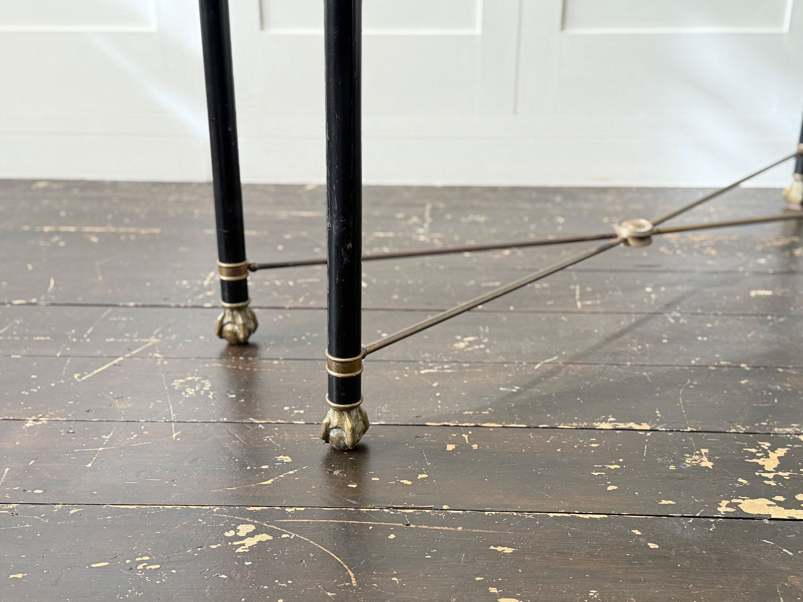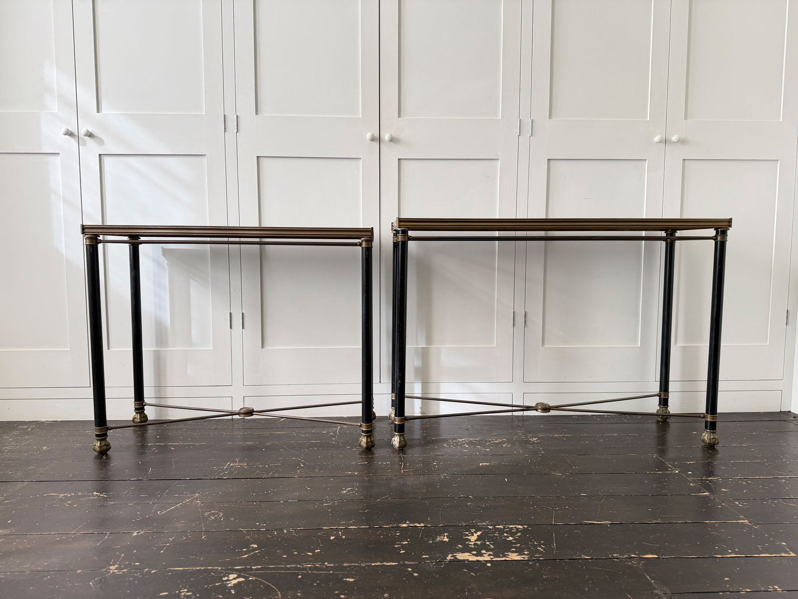 One of two differently sized but matching mid-century console tables of exceptional quality in a distinct Neoclassical design style by Maison Jansen (see p 297 of 'Jansen Furniture' by James Archer Abbott for similar design). With brass frame and black lacquered legs, the brass has a beautiful vintage patina. A notable feature is the use of classical motifs, specifically the decorative brass claw and ball feet, a design element typical of Maison Jansen's work and the central decorative medallion to the centre of the x-form stretcher.