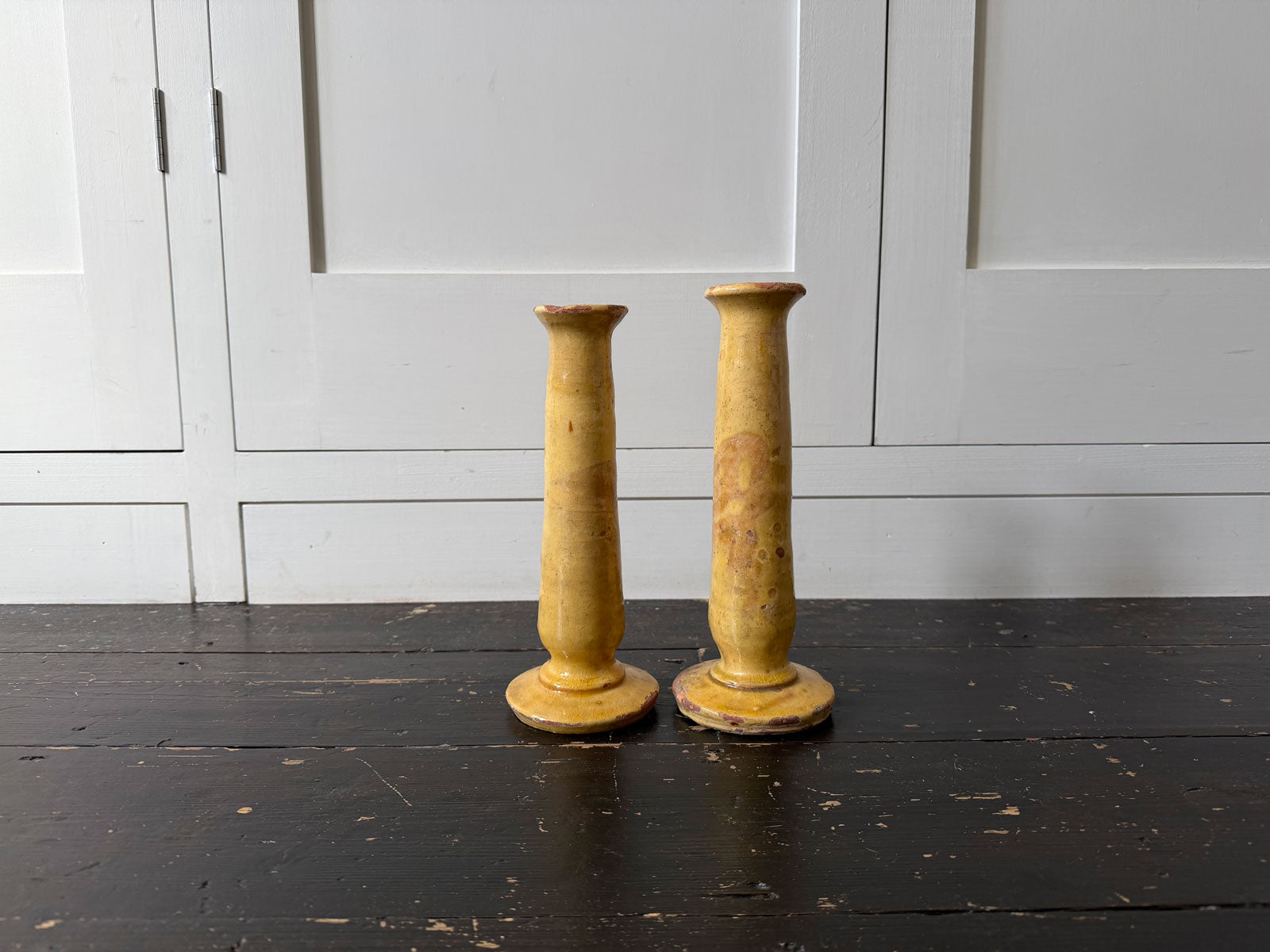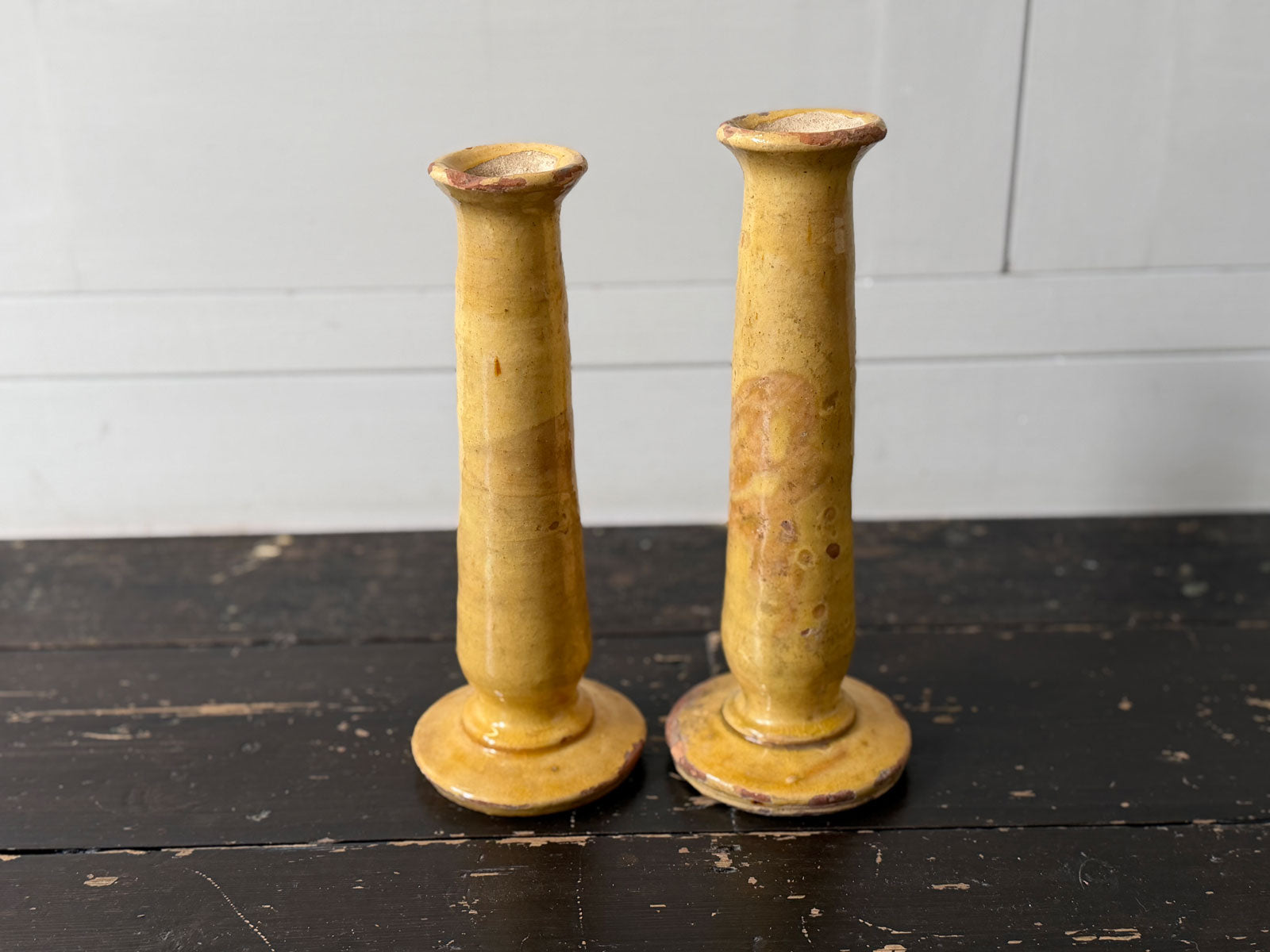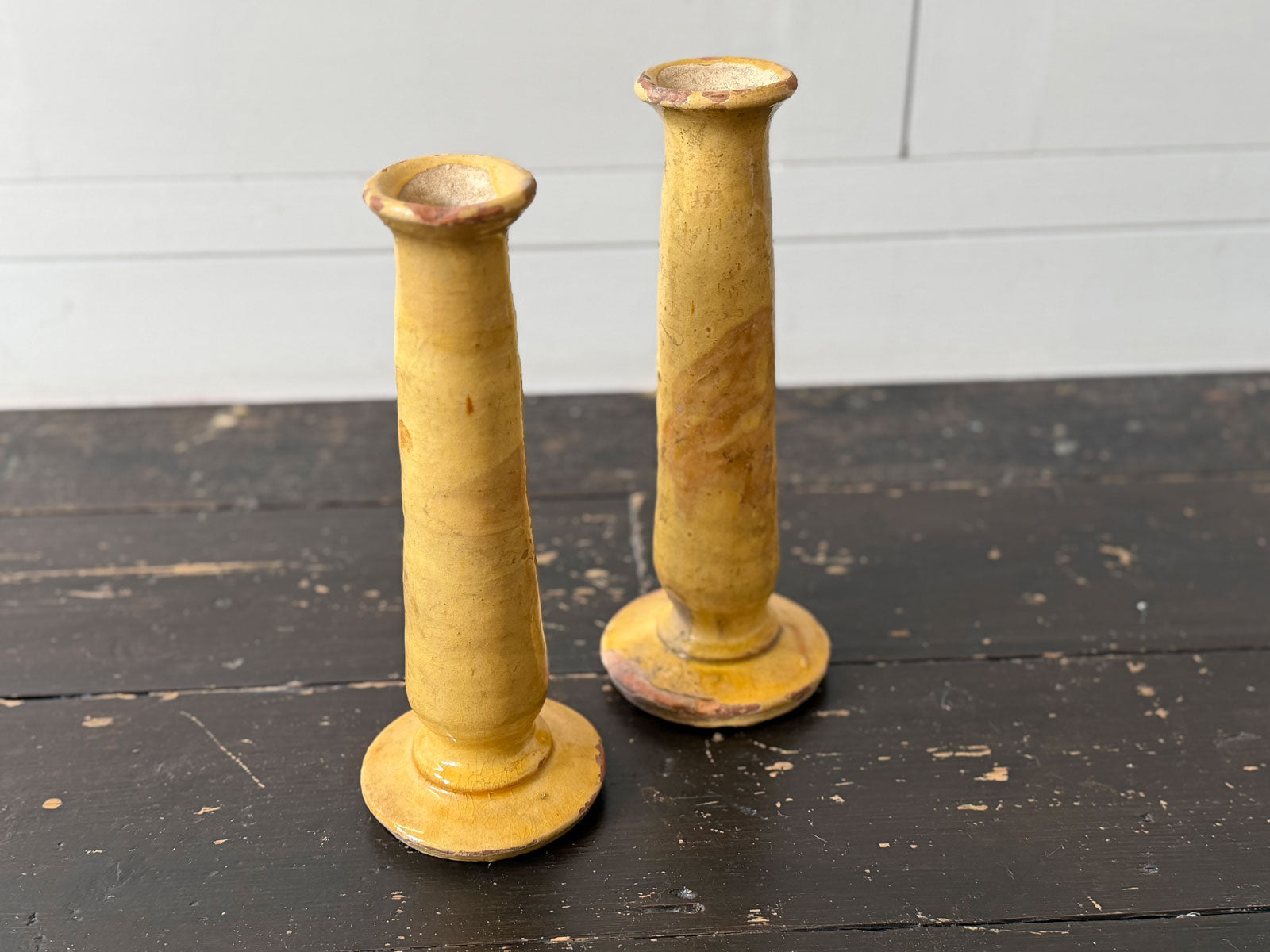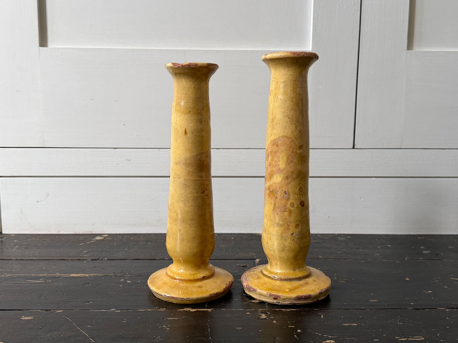 A pair of 18th C ceramic candlesticks made by Dieulefit in France.  It is rare to find a pair of this age still in tact.  Several bumps and bruises which only add their beauty.