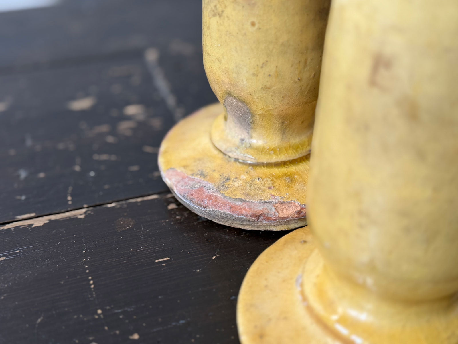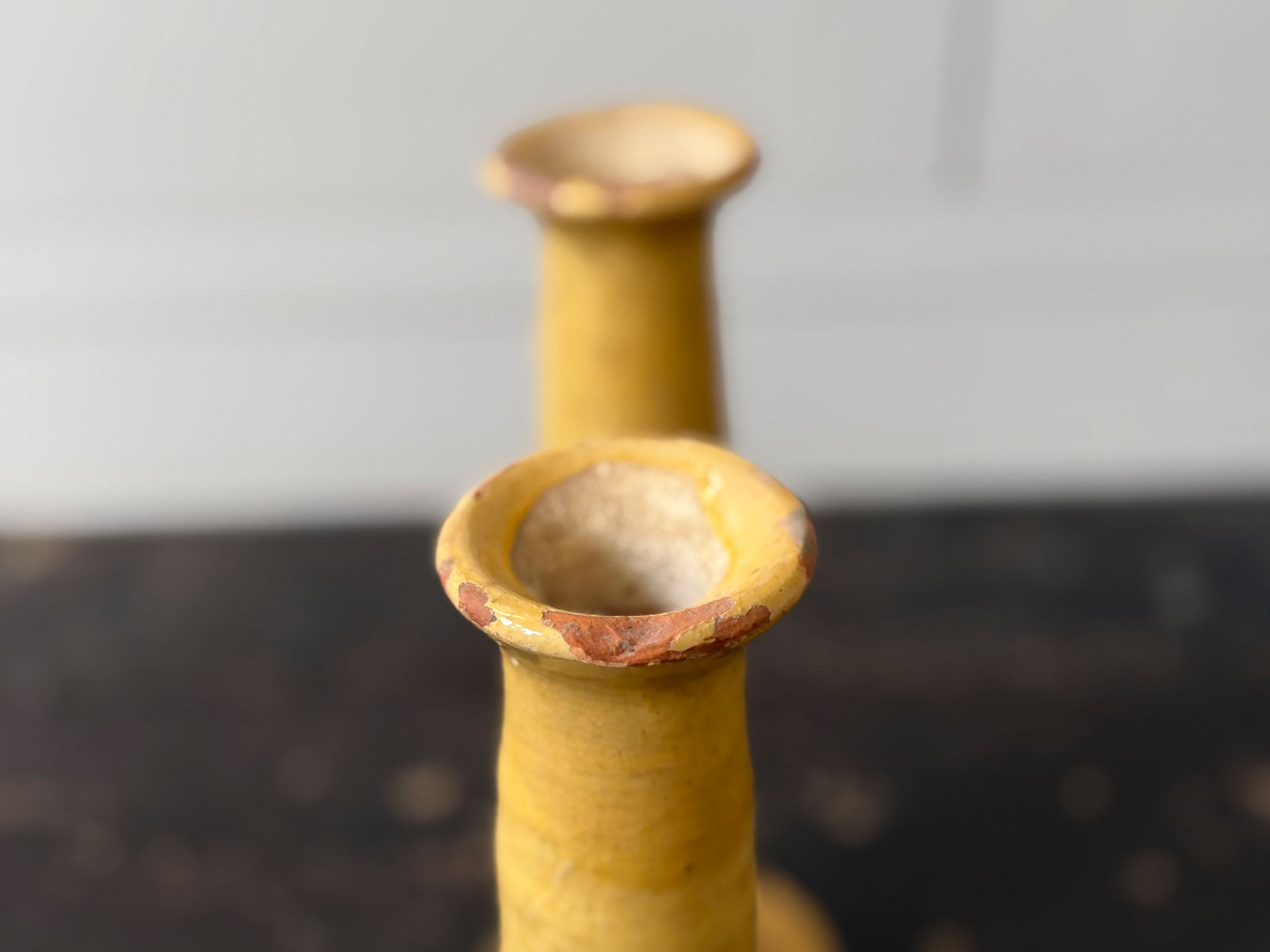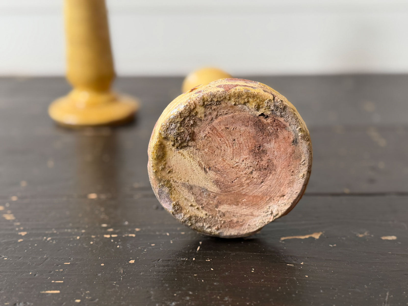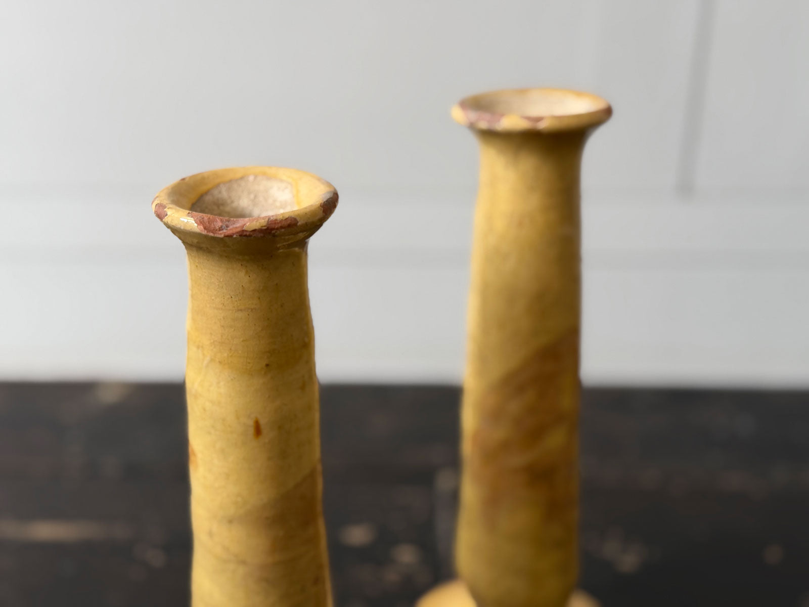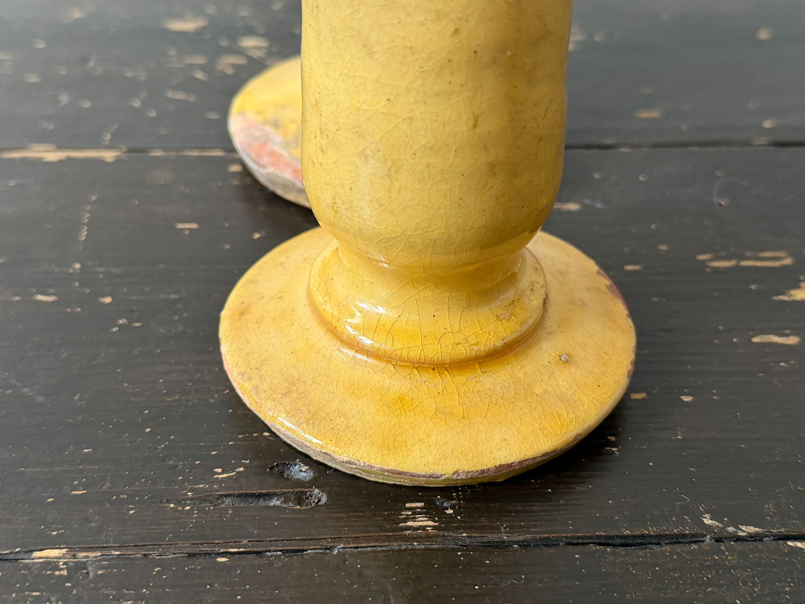 A pair of 18th C ceramic candlesticks made by Dieulefit in France.  It is rare to find a pair of this age still in tact.  Several bumps and bruises which only add their beauty.