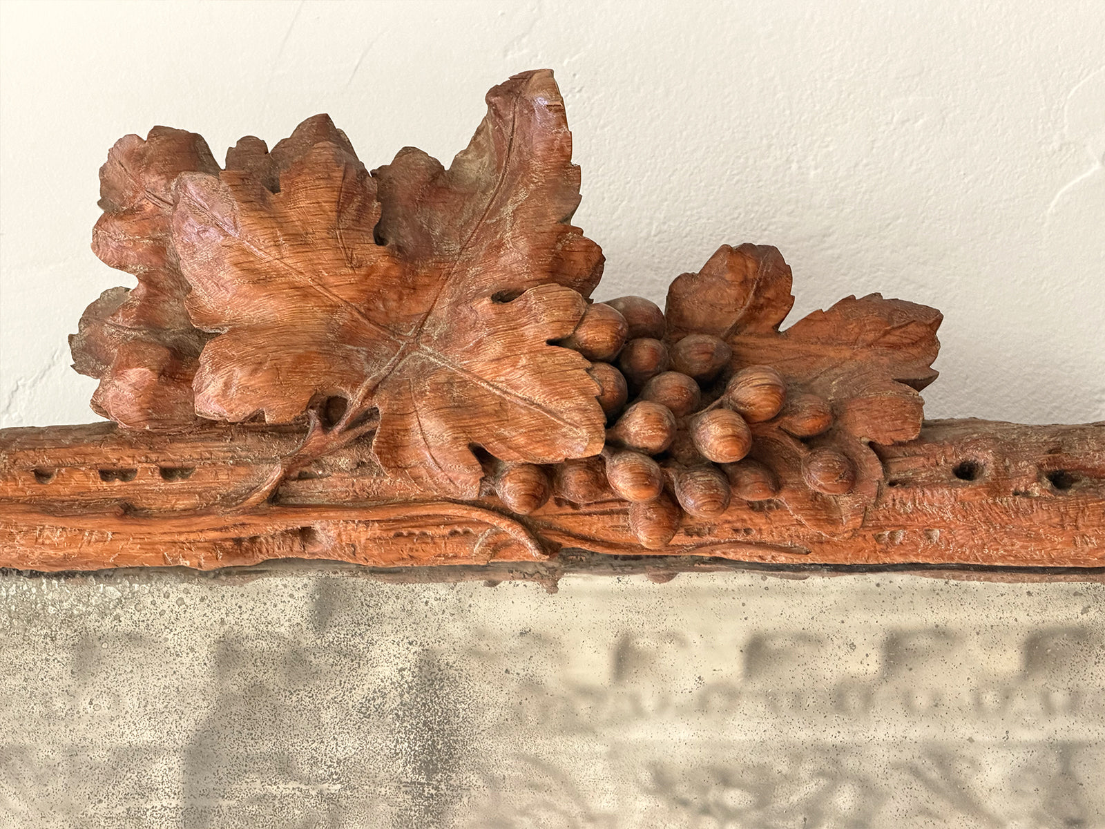A pair of antique mirrors with foxed plate and beautifully hand carved with delicate vine leaves and grapes on the textured cross frame surround.