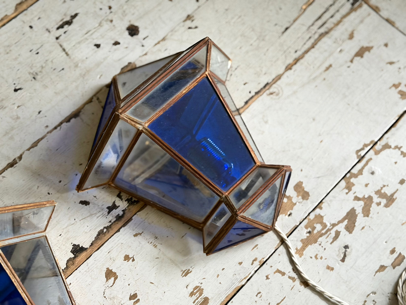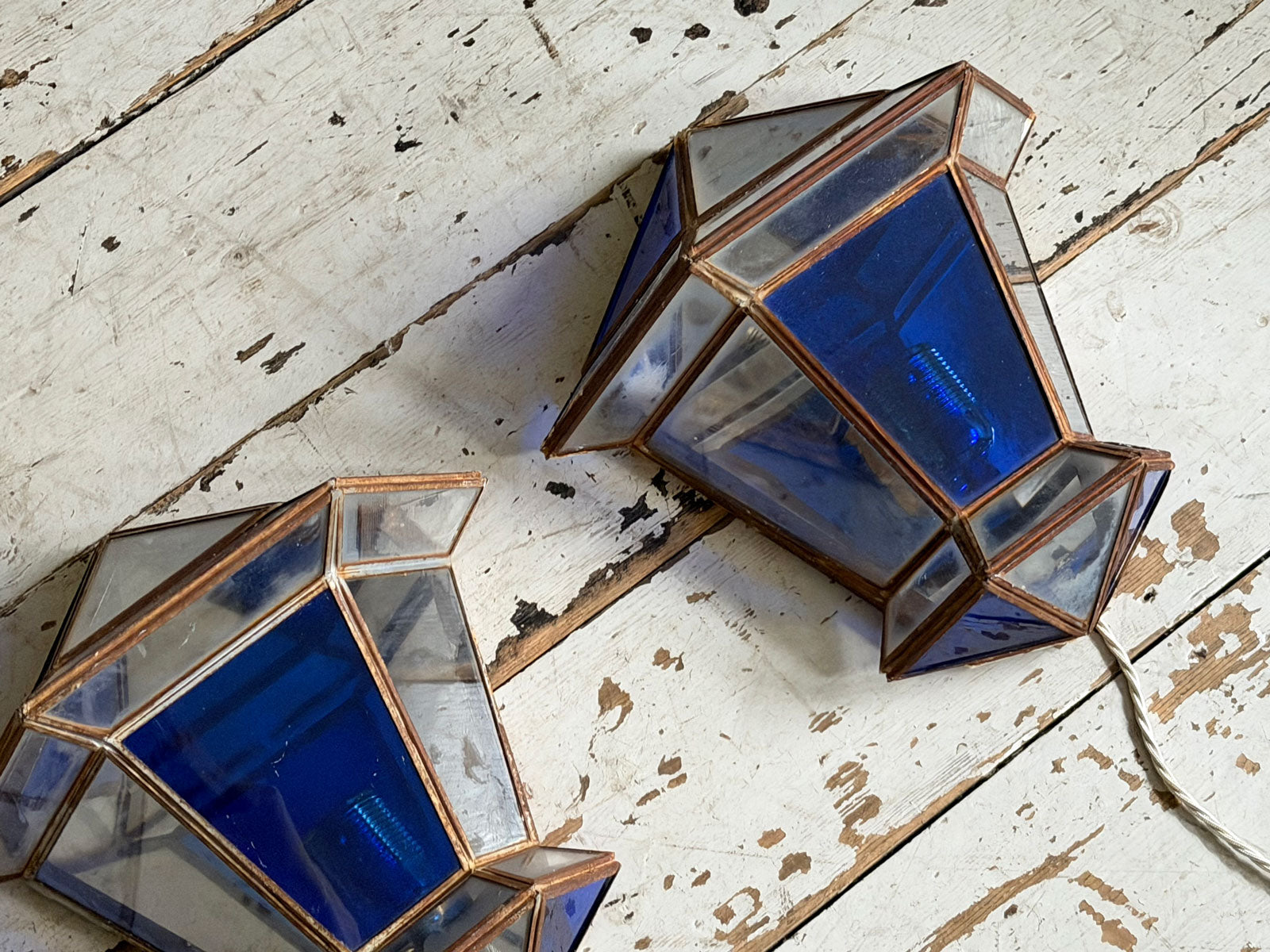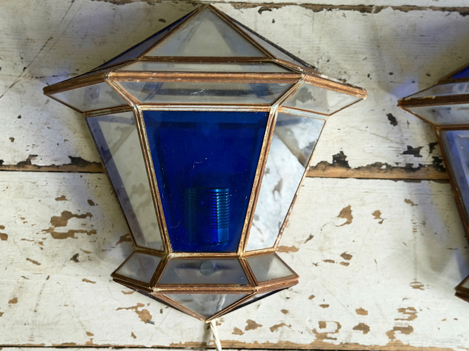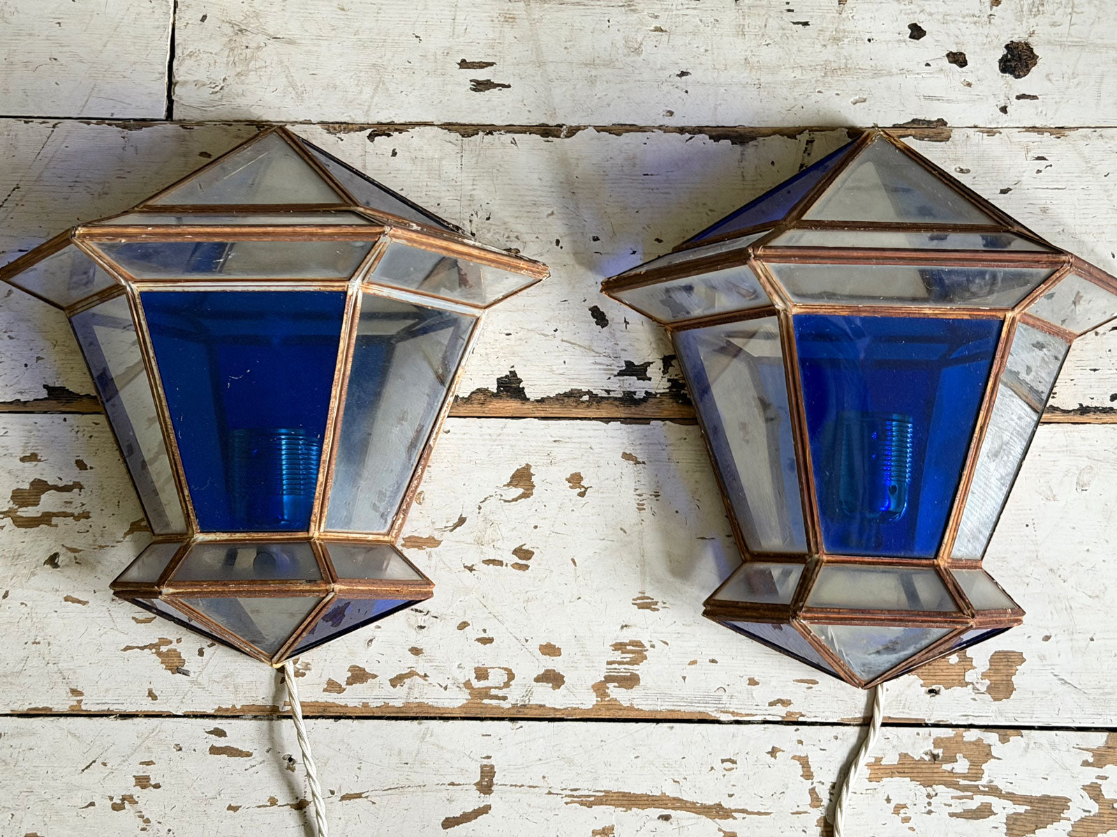 A Pair of Vintage Spanish Blue Glass Wall Lanterns