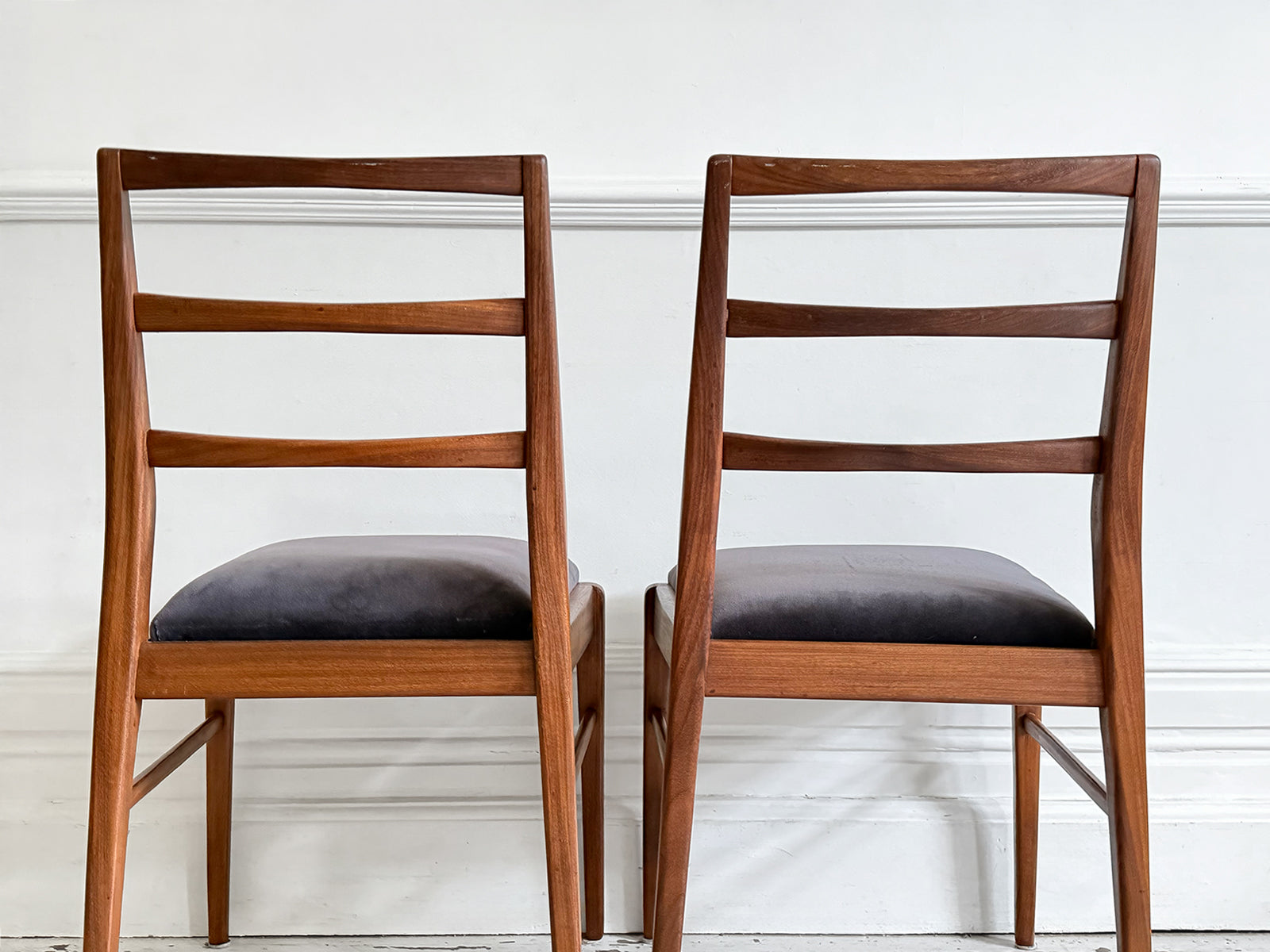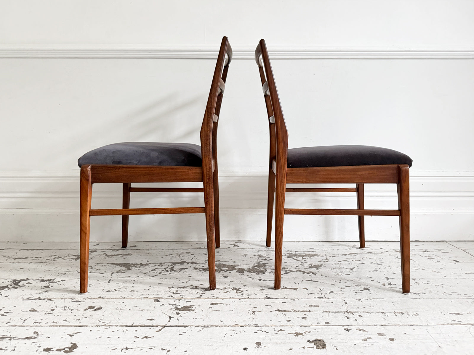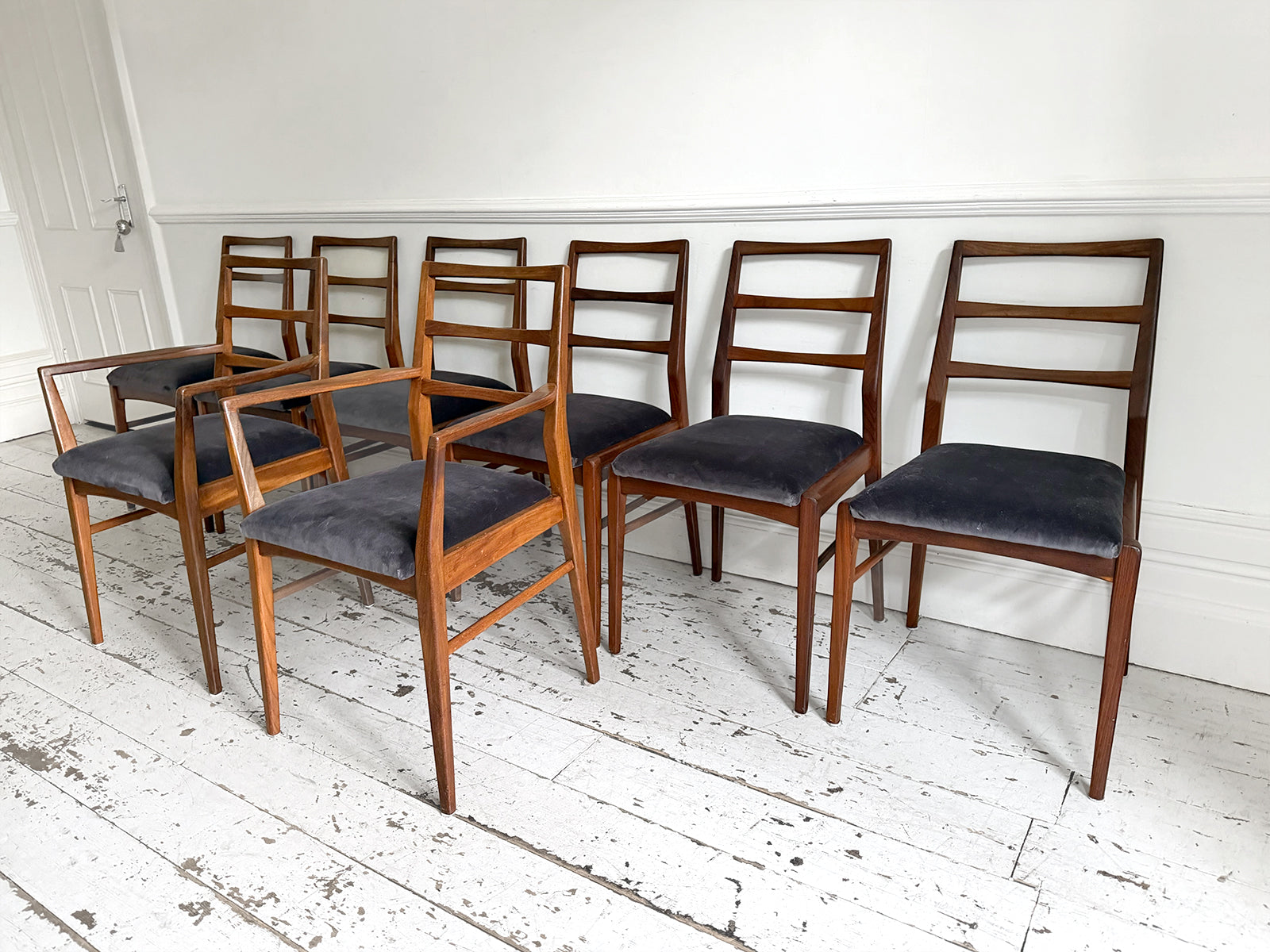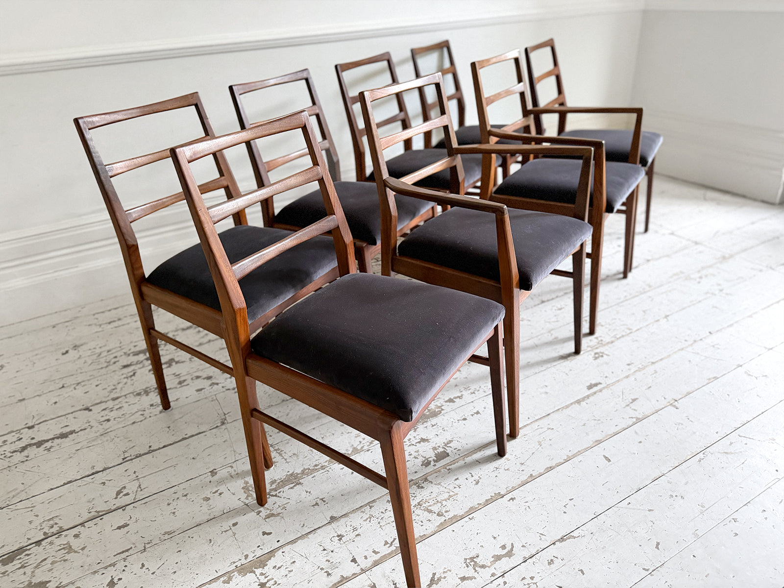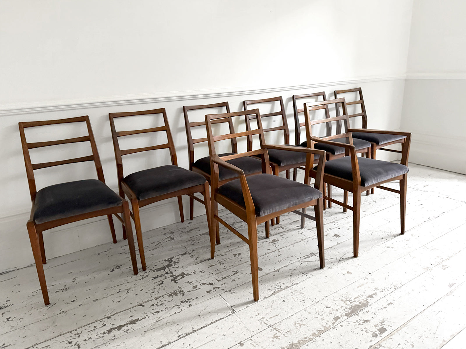 A set of eight dining chairs comprising six singles and two carvers. Designed by Richard Hornby for British manufacturer Fyne Ladye Furniture in 1961 and sold through high end shops such as Heals. Simple and elegant in design, with warm teak frames and newly upholstered with Romo velvet in 'Espresso'.