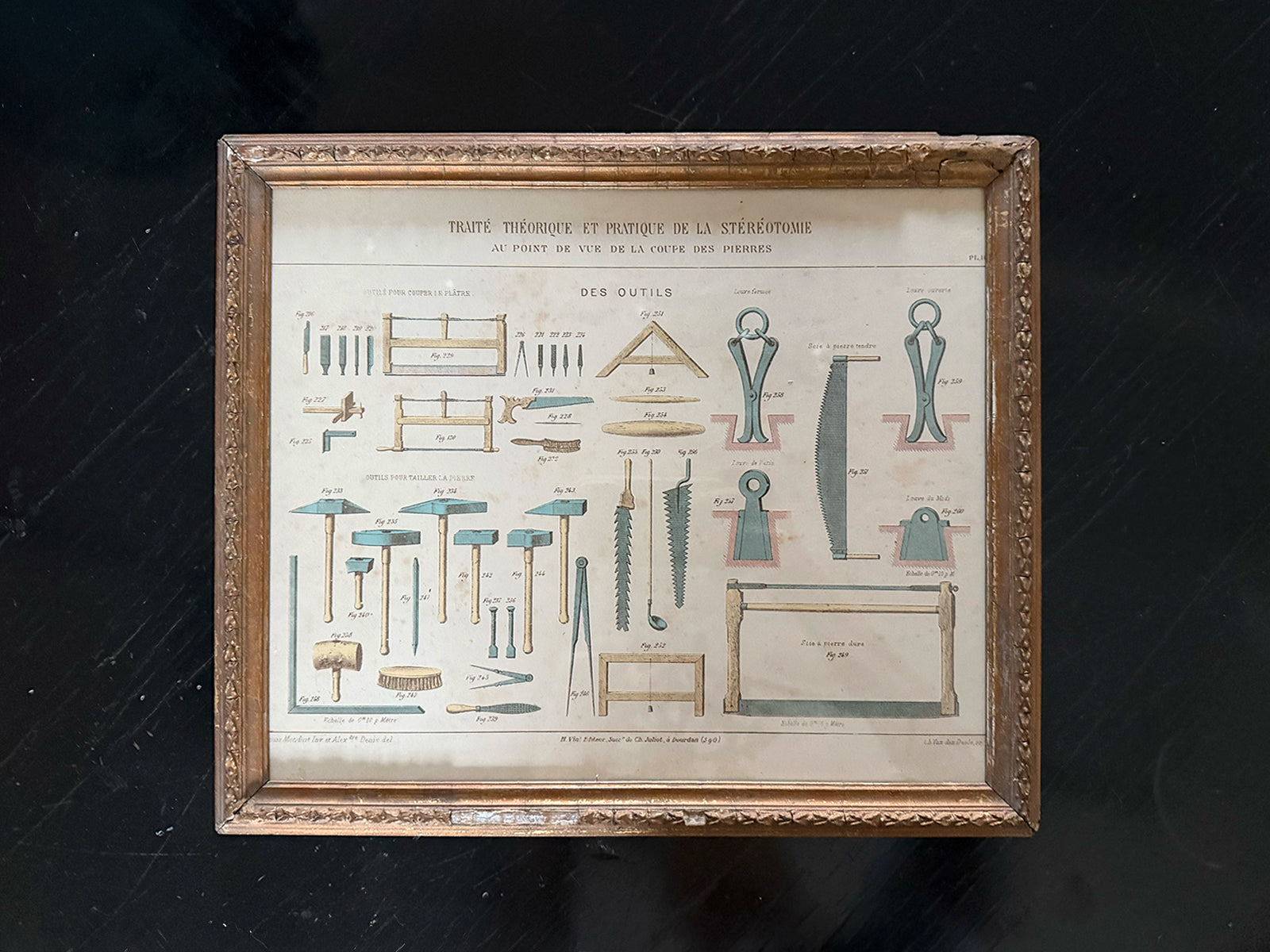 An antique print from an architectural textbook showing a variety of tools needed for stone carving. Framed in a vintage frame.