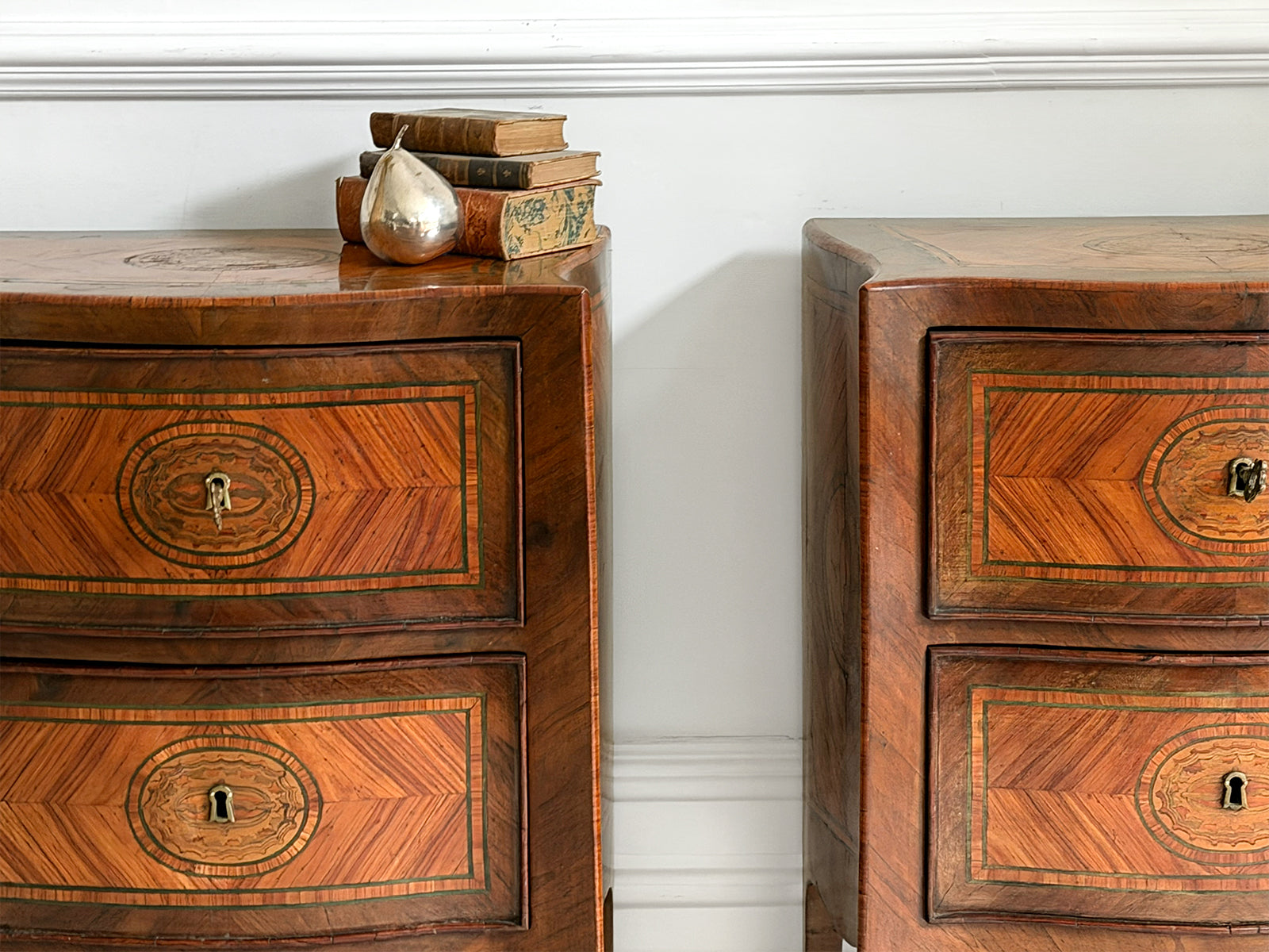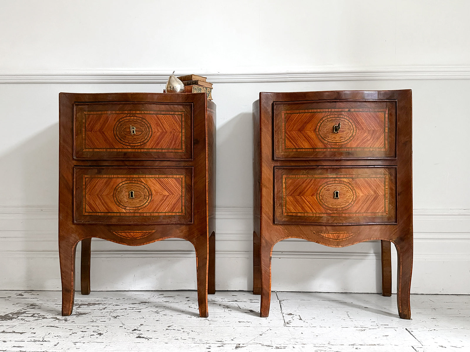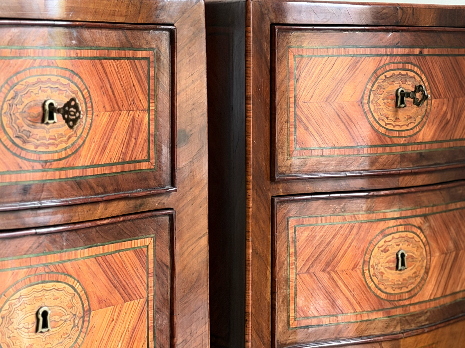 A pair or 18th century 'petite commodes', the serpentine tops centred by a paterae within a king wood ground, banded in tulipwood and a stained green holly line. Each edge crossed banded and above two drawers similarly decorated as the tops and raised on slender cabriole legs with serpentine apron. Ideal bedside tables or side tables.