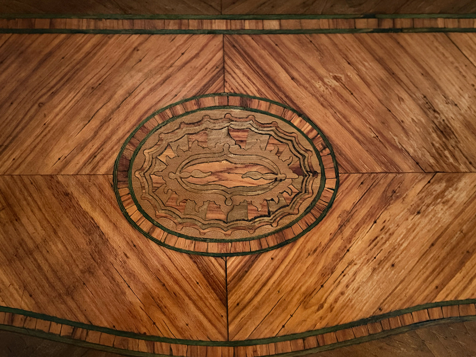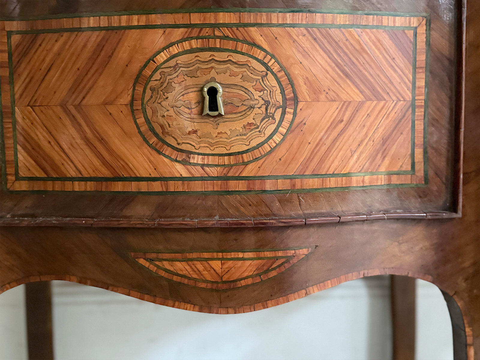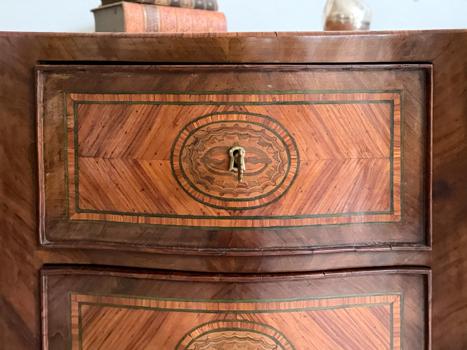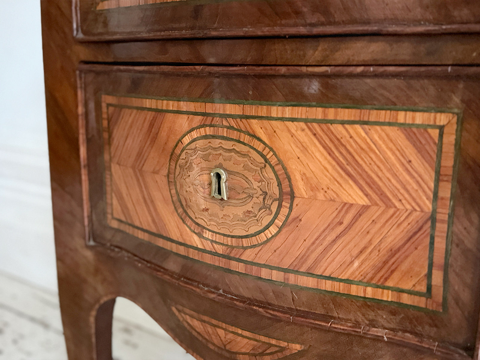 A pair or 18th century 'petite commodes', the serpentine tops centred by a paterae within a king wood ground, banded in tulipwood and a stained green holly line. Each edge crossed banded and above two drawers similarly decorated as the tops and raised on slender cabriole legs with serpentine apron. Ideal bedside tables or side tables.