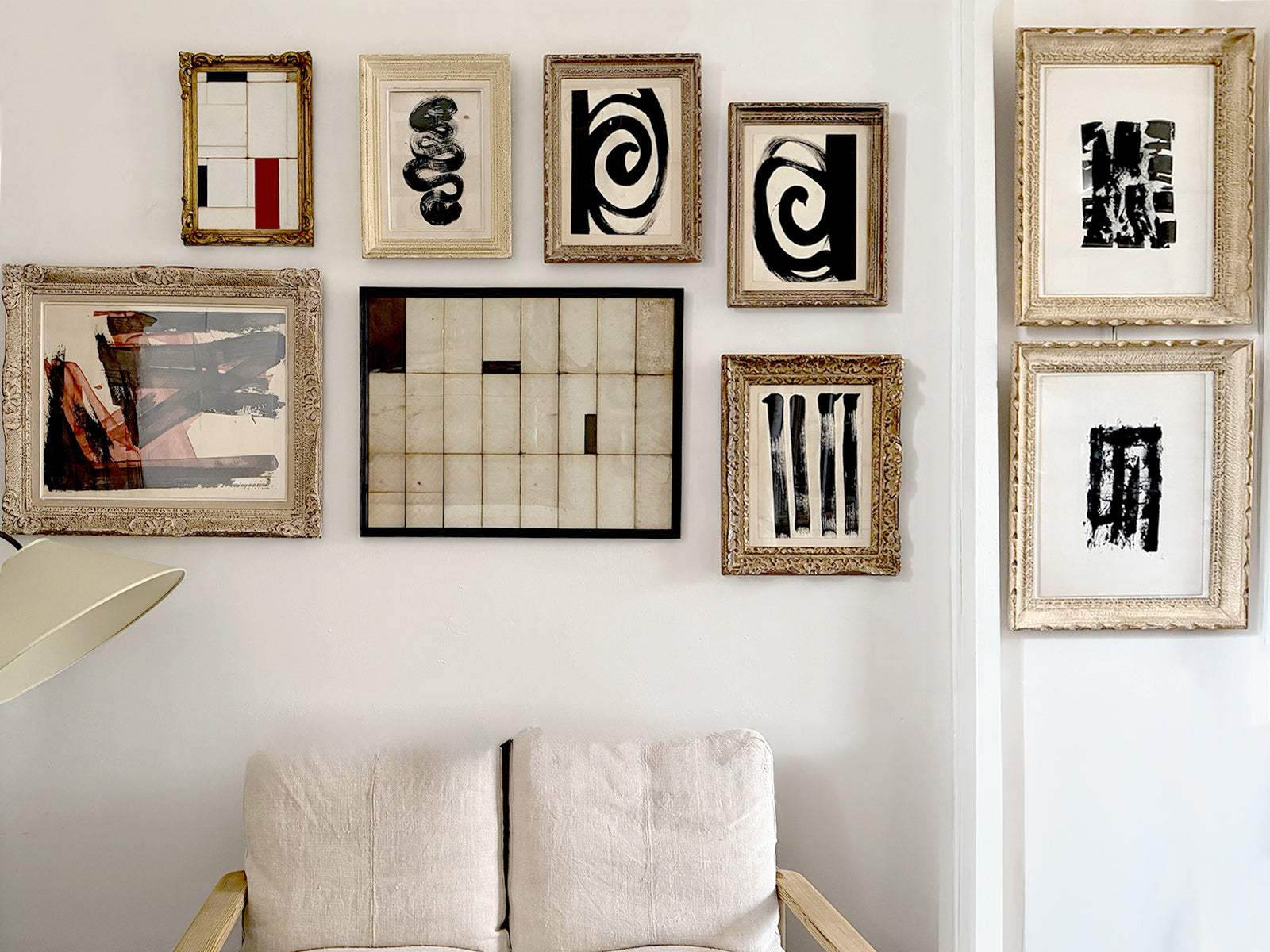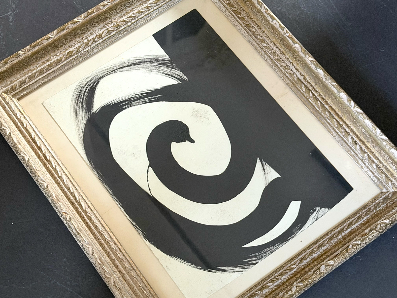 One of four abstract artworks by the same artist (unknown) in black acrylic on paper and framed in an antique Montparnasse frame
