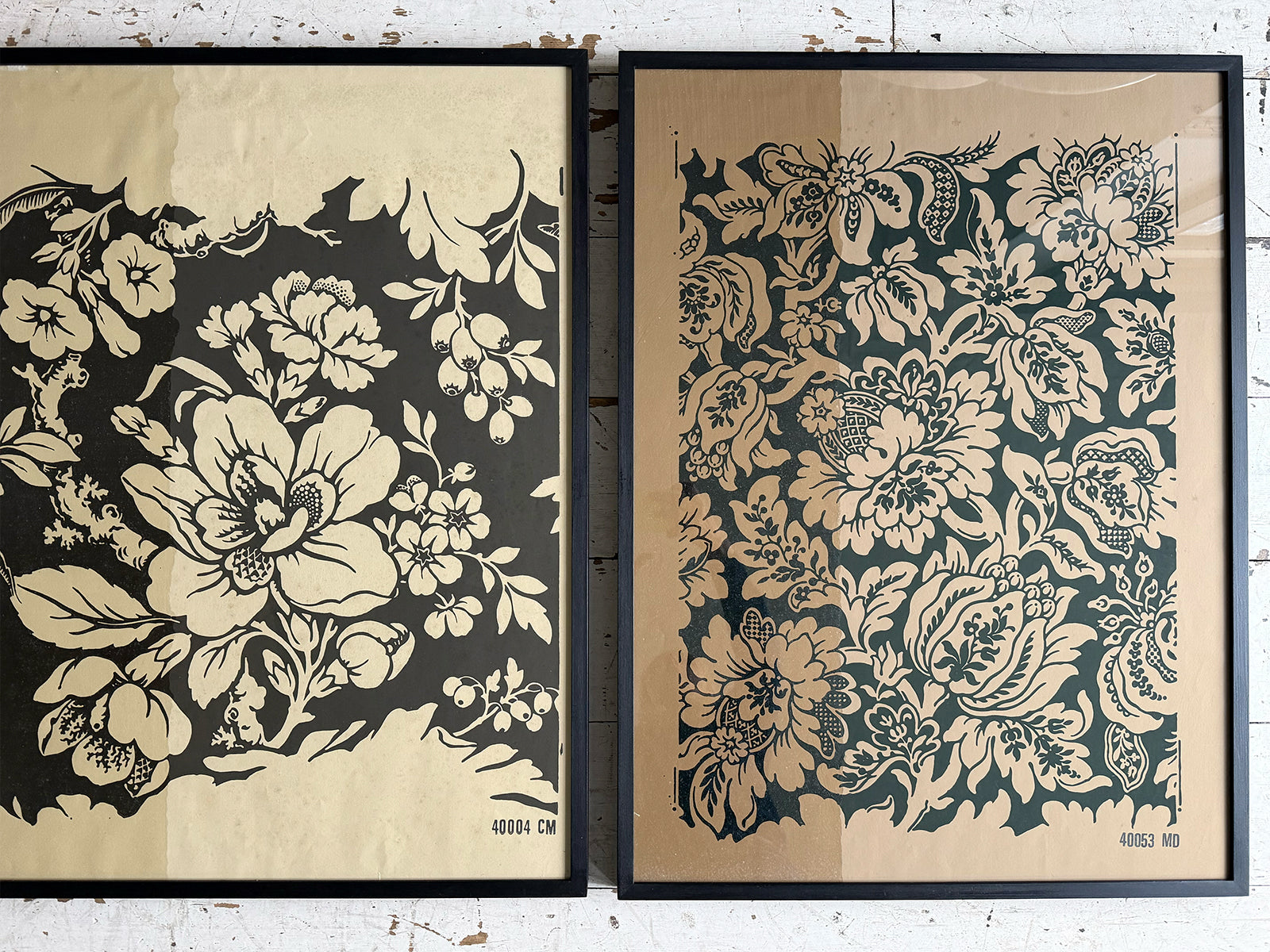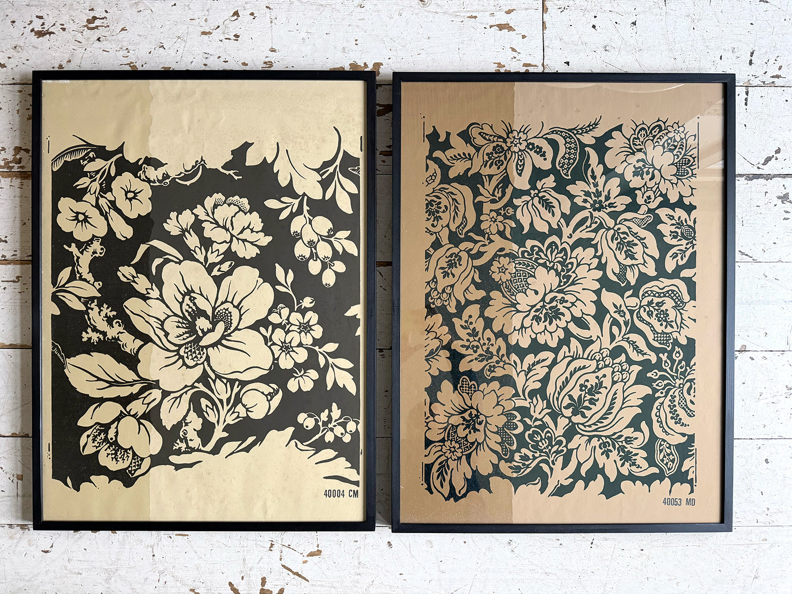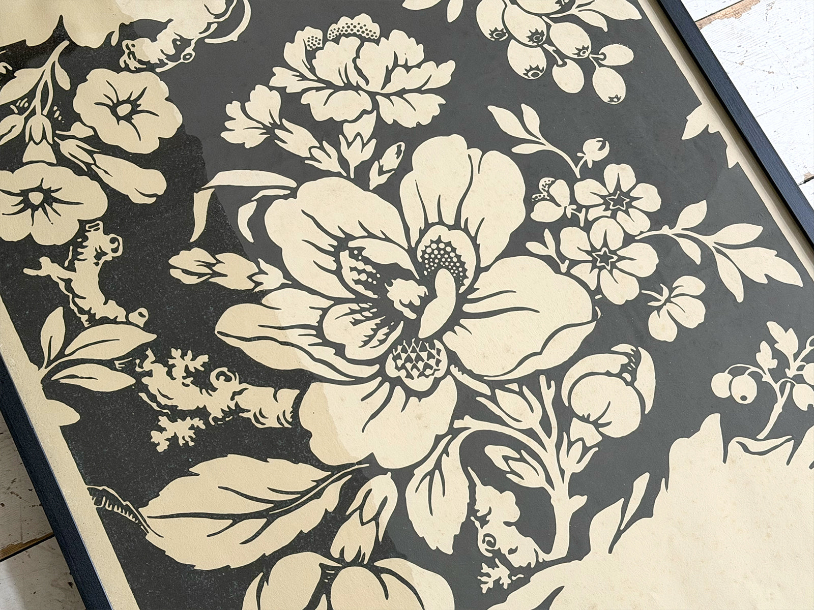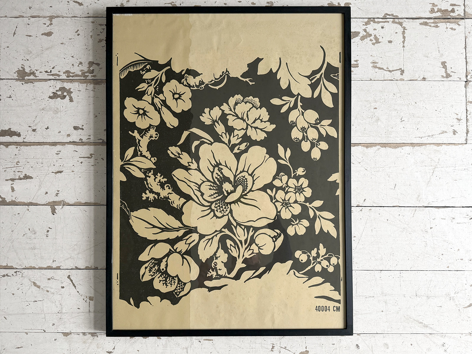 We were excited to find this large 1950's Zuber sample book containing page after page of beautiful Zuber wallpaper designs, hand block printed in wonderful colourways.  We have selected eight of these samples and framed them in simple, contemporary frames. Some of them include a strip of the sample with a glazed coating. Because of their large size, these pieces are wonderful as a stand artwork and even better in a group.
