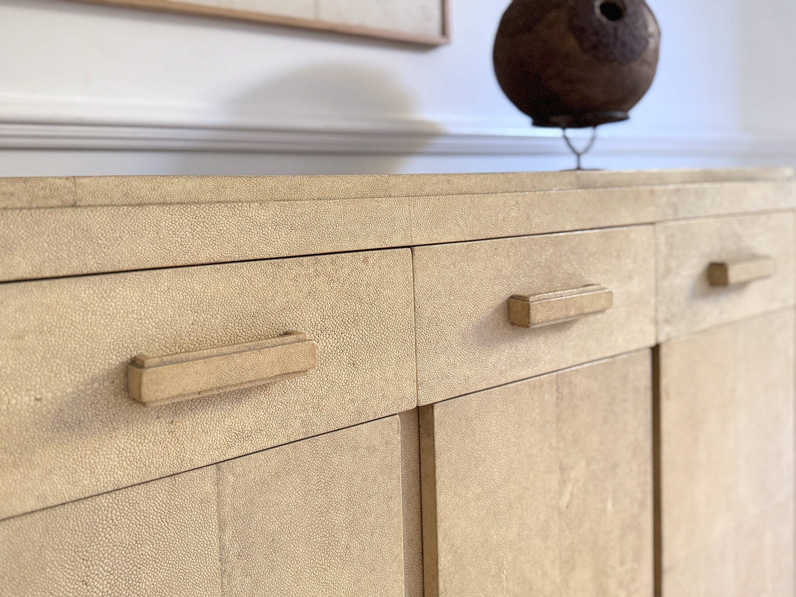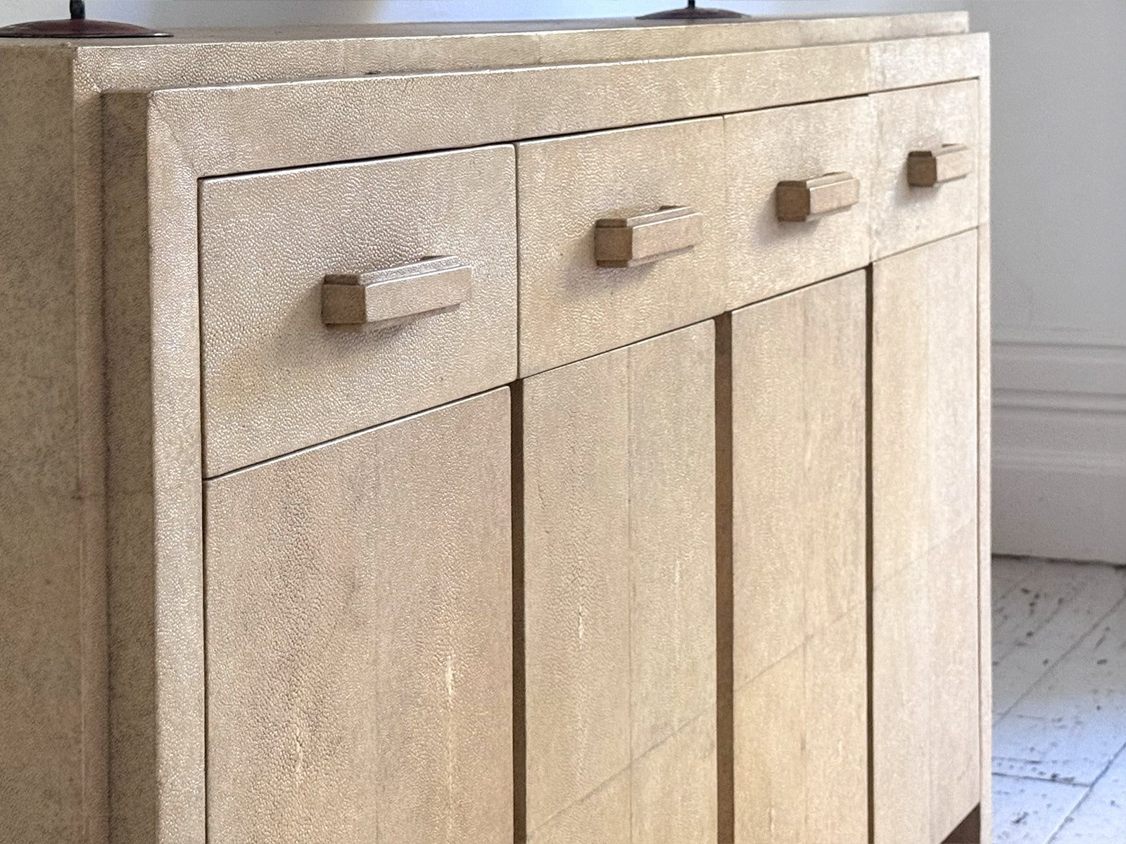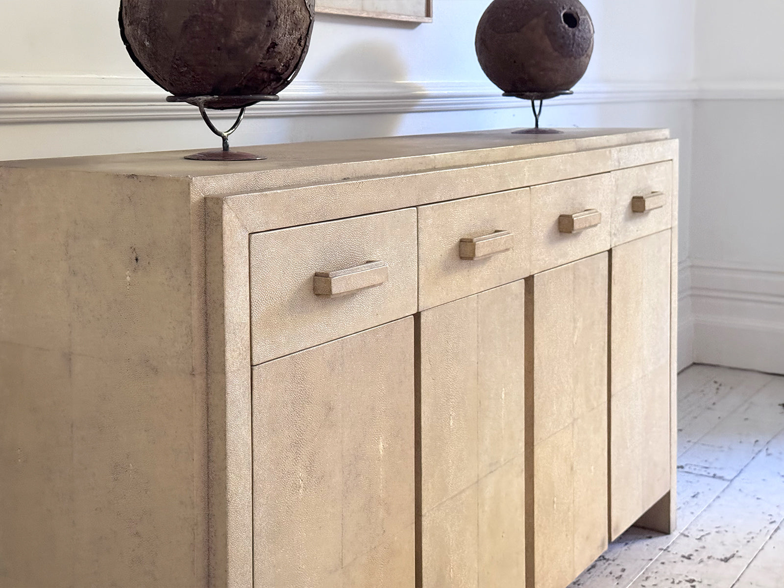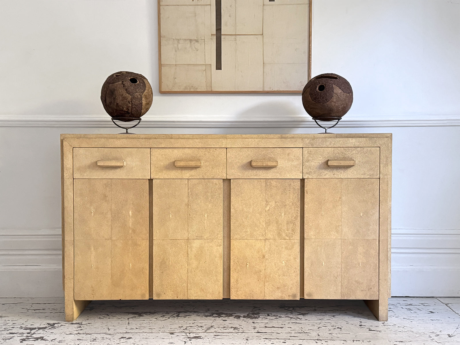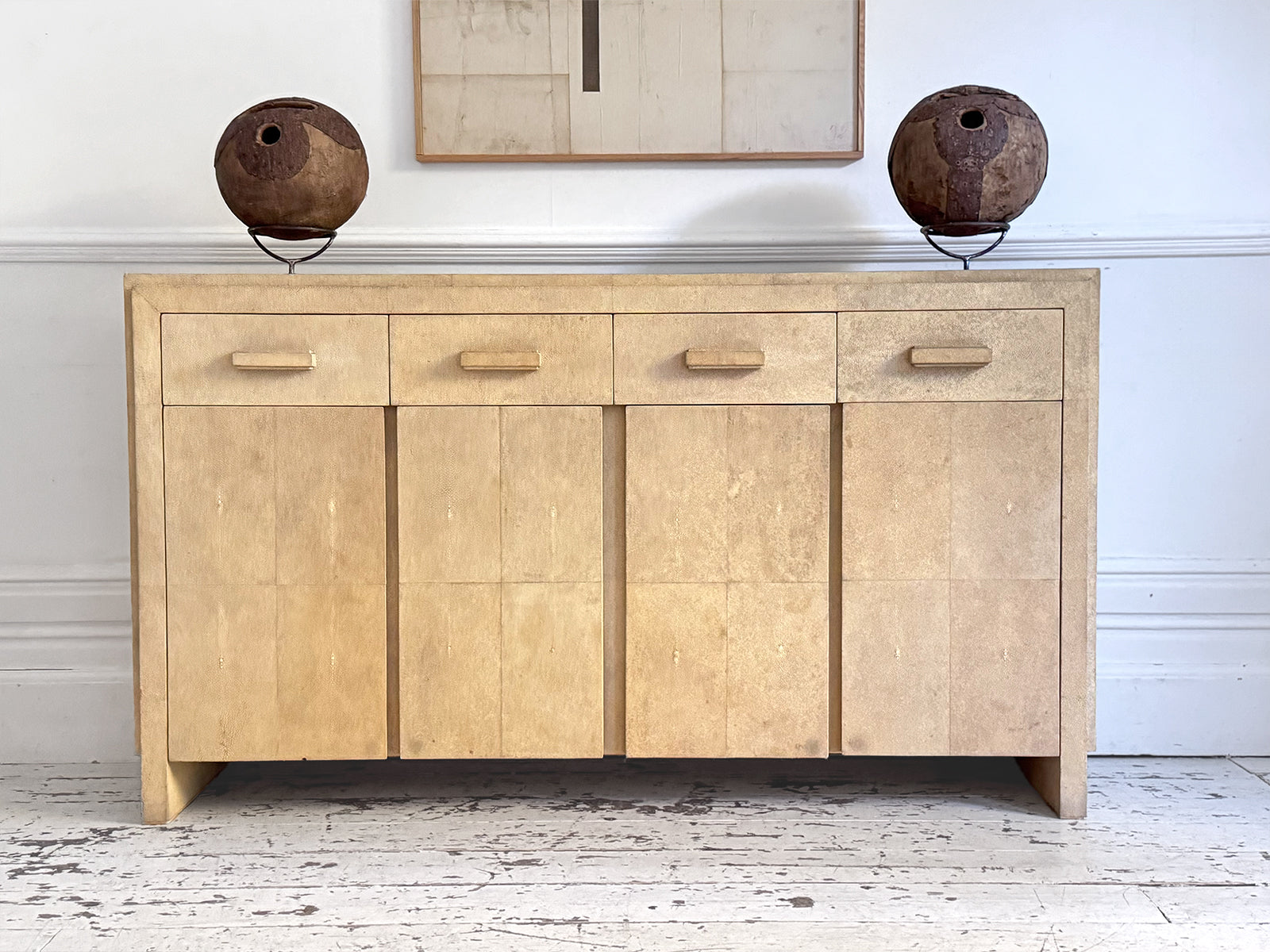 A 1970's shagreen four door, four drawer sideboard with shelved interior.
