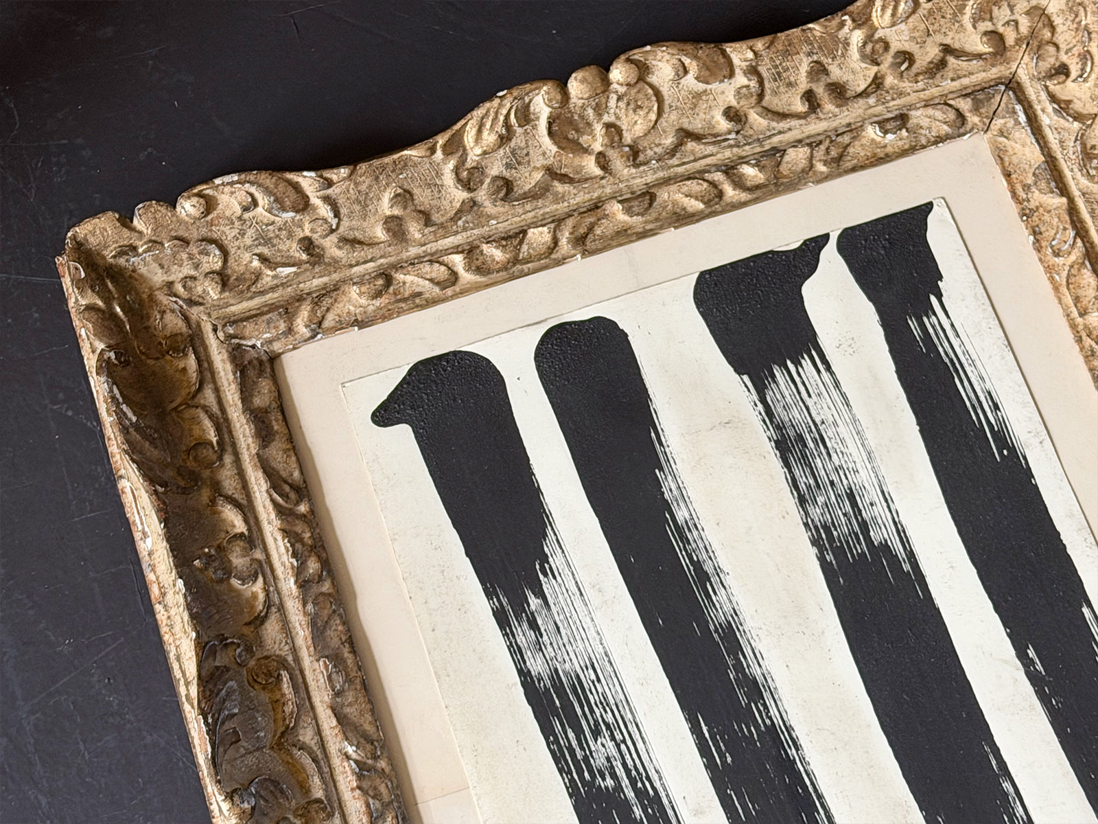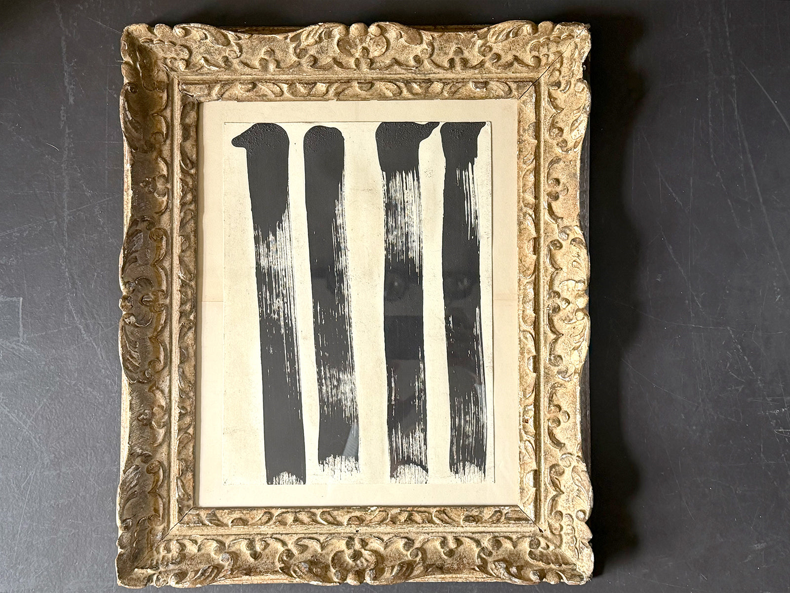 One of four abstract artworks by the same artist (unknown) in black acrylic on paper and framed in an antique Montparnasse frame