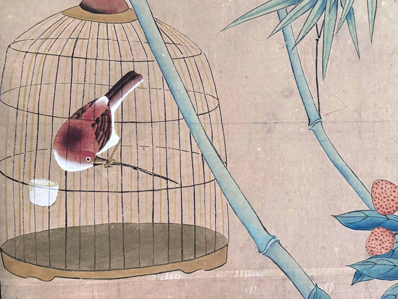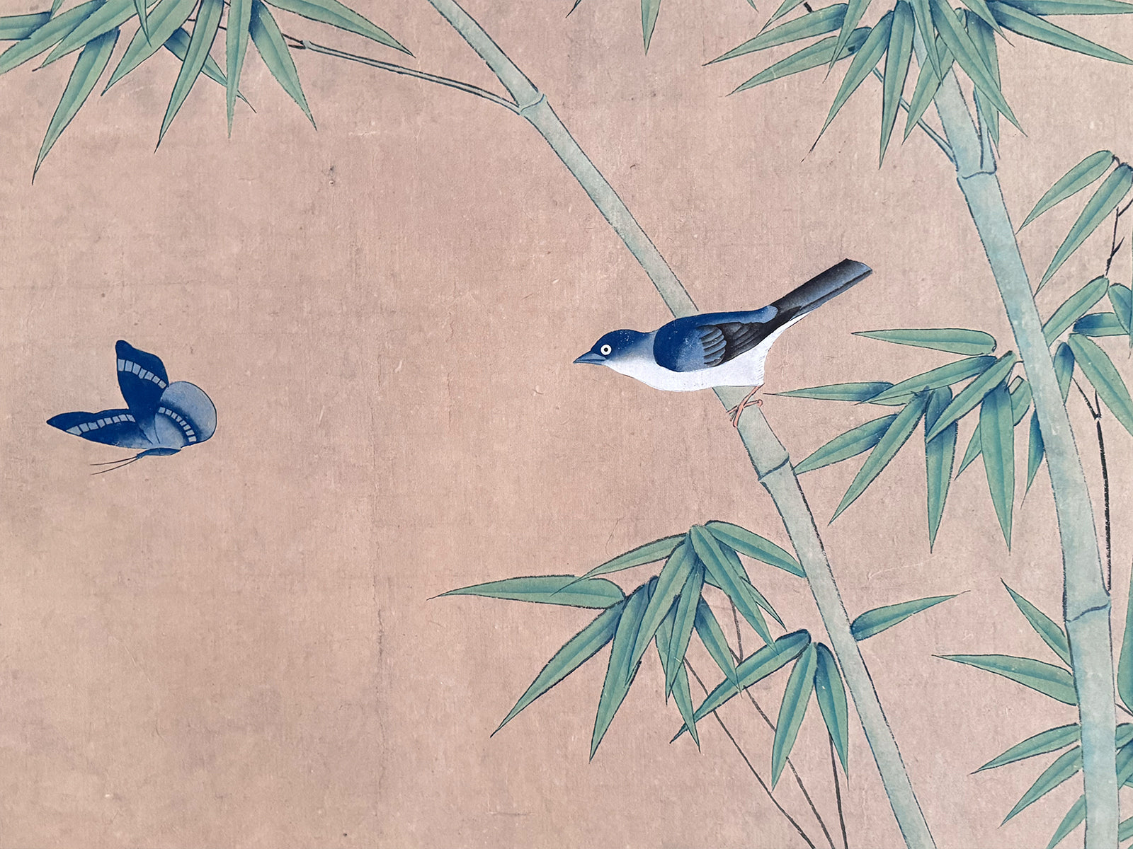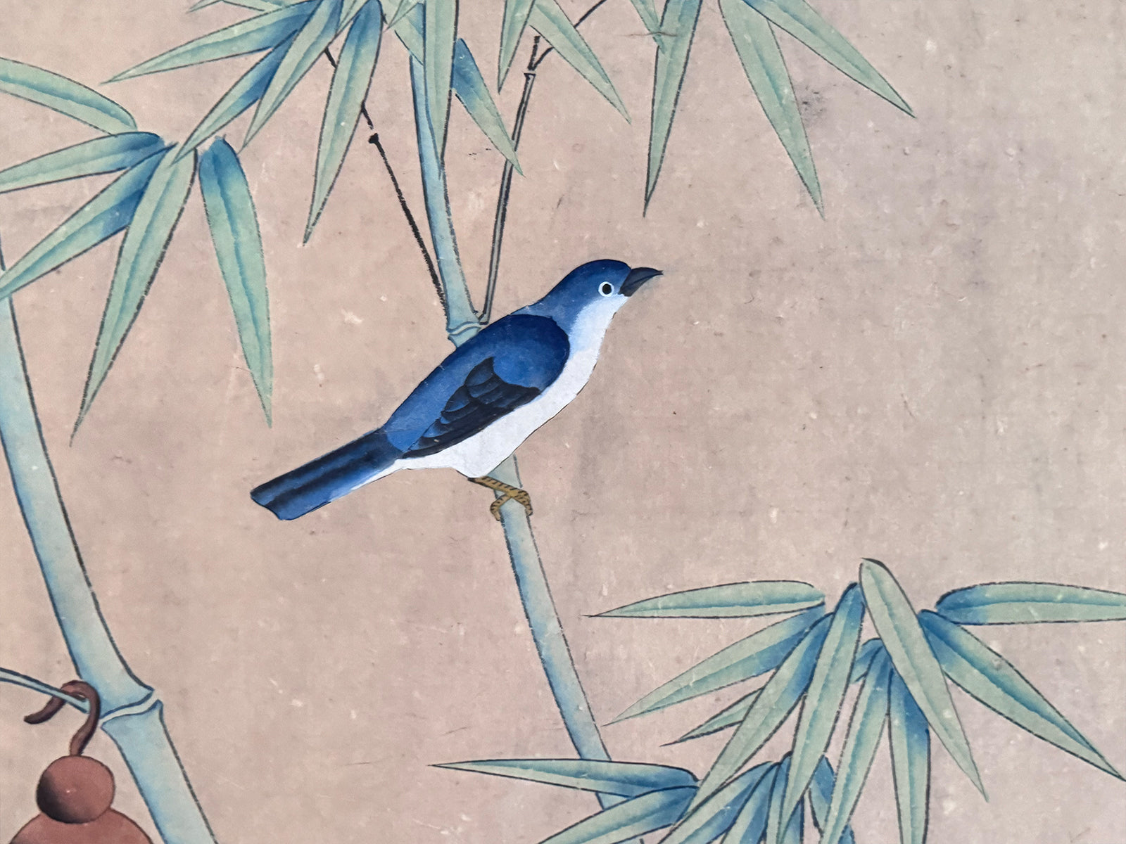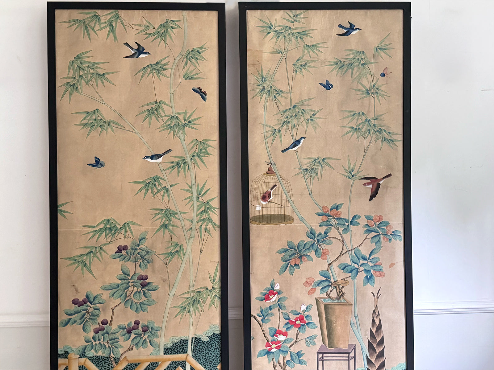 A pair of very large antique Japanese paintings depicting a peaceful scene of berries, birds, flora, water and bamboo over two framed panels.