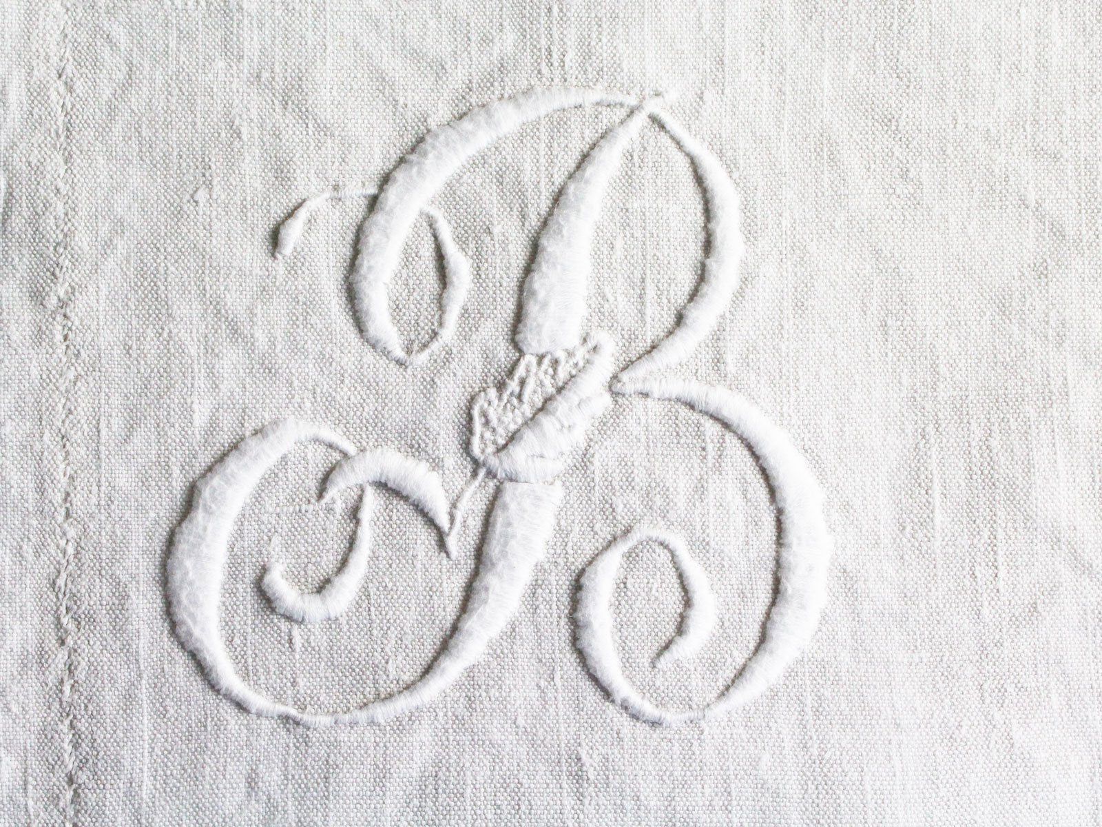 This white on white embroidered B monogram is suitable for a 30cm square cushion (see image of square cushion sizes) and is mounted on an antique French linen background.